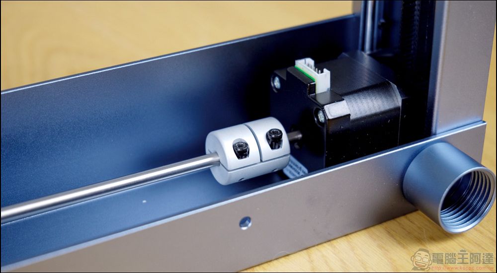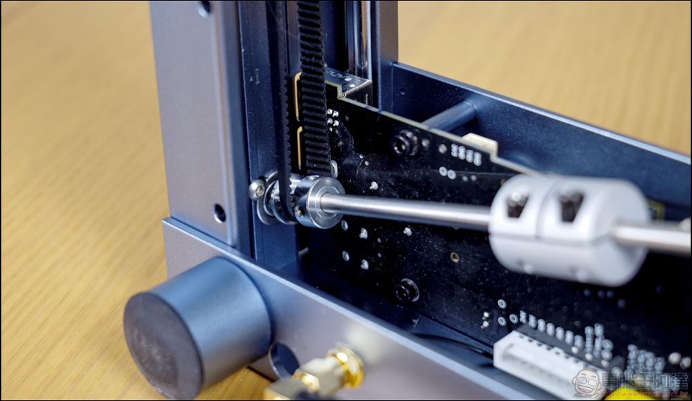 接著透過一個卡榫,將傳動軸與馬達之間連結起來,再鎖上之前要記得確定兩邊的傳動帶都處於放鬆的狀態,先將傳動軸鎖緊以後,才將傳送帶鎖好,否則如果兩邊傳送帶在有應力差的情況下,極有可能造成加工時左右的傳送帶存在偏移,導致完成品出現瑕疵,這點要非常小心: