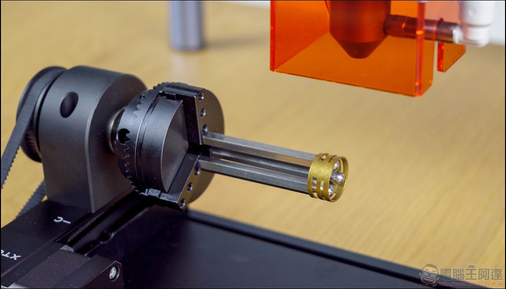 xTool RA2 Pro旋轉套件,相比前一代最大的特點就在於從滾筒旋轉升級為滾筒旋轉+卡盤旋轉+球型旋轉+環型旋轉四合一旋轉套件:
