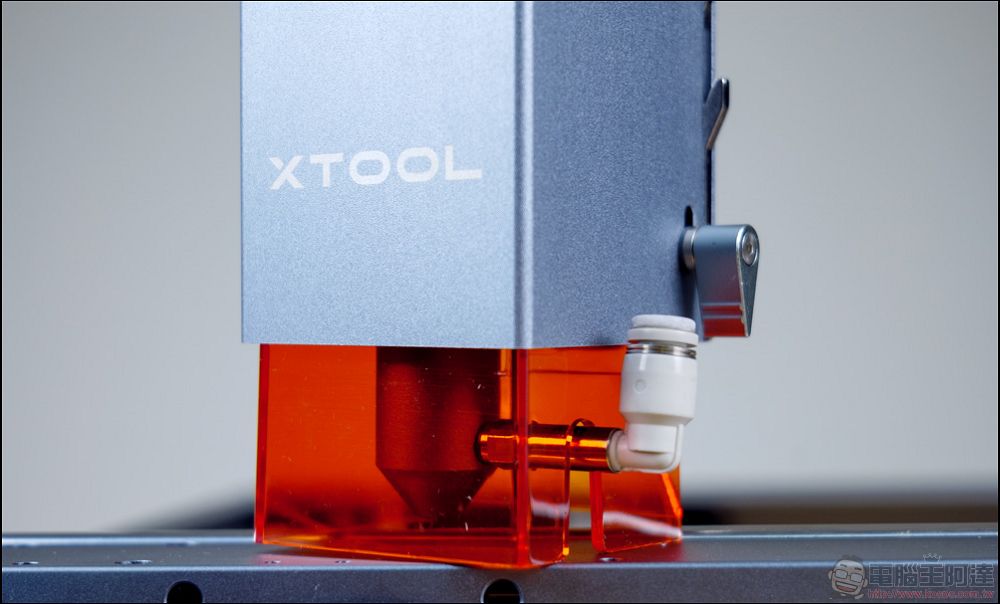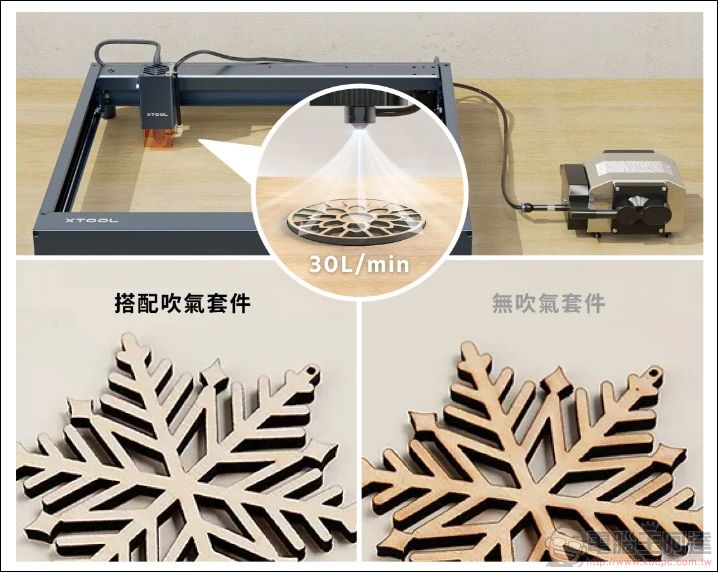 這個噴嘴主要是拿來連接xTool獨家研發的「吹氣套件」,可以提供30L/min的強力氣流,吹散表面的焦油還有因高溫產生的煙霧,可以使作品更加乾淨俐落及大幅度降低雷射鏡片的污染: