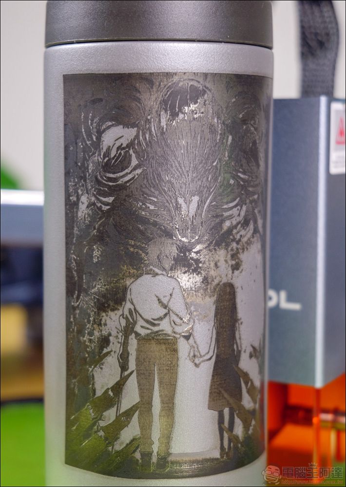 接著我們將同一張圖雕到保溫杯上面,可以發現在細節的部分,金屬雕刻也非常細緻,而且我們還是圓柱體加工,再進化的精度與細度,讓完成品的呈現非常的酷炫,速度也非常的快,搭配滾筒雕刻時間約為三個小時: