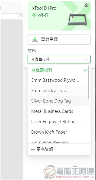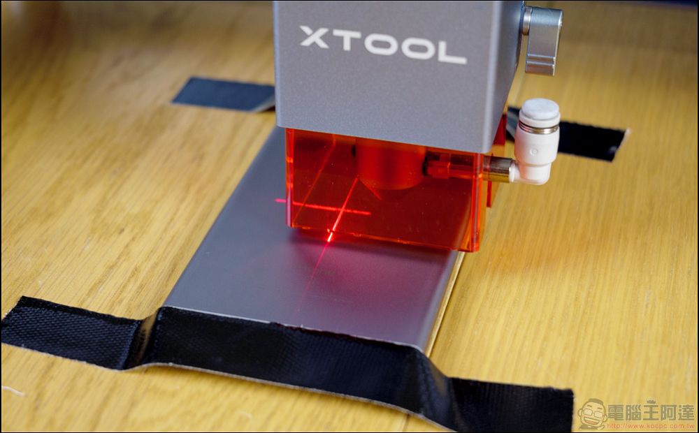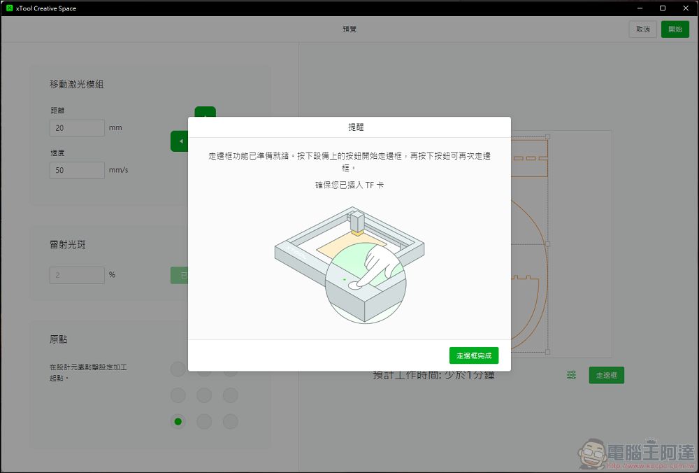 設定好加工的模式後,就可以按下加工進行加工前的調整,這跟之前xTool M1的邏輯是完全不一樣的,M1有自己的預覽相機可以定位,而D1 Pro則是因為沒有相機定位,所以需要自己做定位,因此在定位的部分,是透過雷射模組的十字紅外線做定位,不過大家看了也會發現十字跟雷射頭不同位置,這時候不用擔心,因為實際雷雕的定位是依照十字的位置為主,所以以紅外線為主就對了: