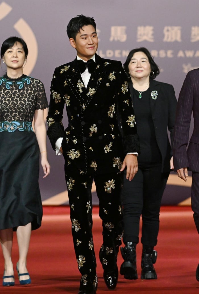 以《我吃了那男孩一整年的早餐》雙料入圍新演員與原創音樂兩個獎項的周興哲,在紅毯戰袍上選擇也是相當大膽,以GUCCI 2023春夏系列金色刺繡天鵝絨套裝加身,優雅貴氣十足!