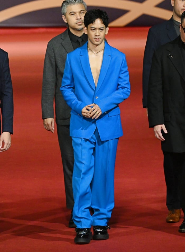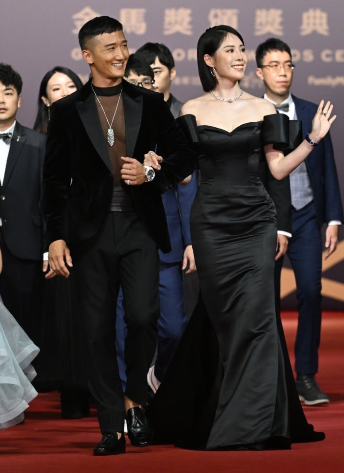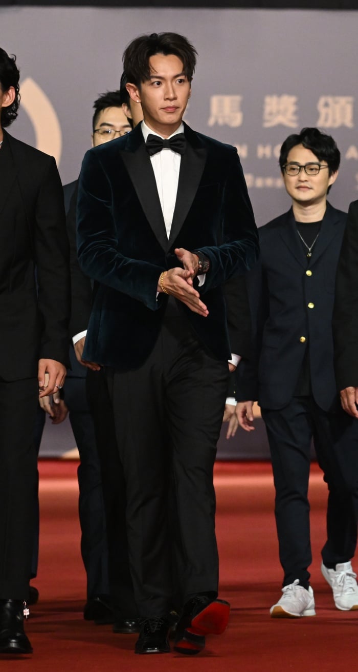 以《黑的教育》入圍金馬新導演的柯震東身穿HUGO BOSS 2023早春系列絲絨材質的孔雀藍西裝踩上紅毯,搭配的是CHRISTIAN LOUBOUTIN的Vatik 黑色漆皮方頭綁帶皮鞋,作為史上第一個拿過金馬新演員獎項後又入圍新導演的他,比起去年的休閒搭配看起來更加正式。
