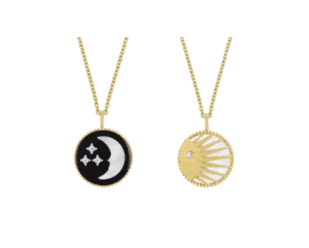 1946 年迪奧先生在路上撿到一顆金屬星星,他便將星星視為自己專屬的幸運象徵,從那刻起更加確立了自己品牌的創立,開始寫下 Dior 的傳奇的第一頁。Victoire de Castellane 傾心設計幸運星的珠寶作品,延續 Rose des Vents 系列的瑰麗歷史,在幸運星的恆久的見證下,太陽和月亮也都爭相的展示耀眼奪目的星球力量。項鍊可以隨著配戴者喜好翻轉的日與月,代表了兩種截然不同的美、溫度和力量。