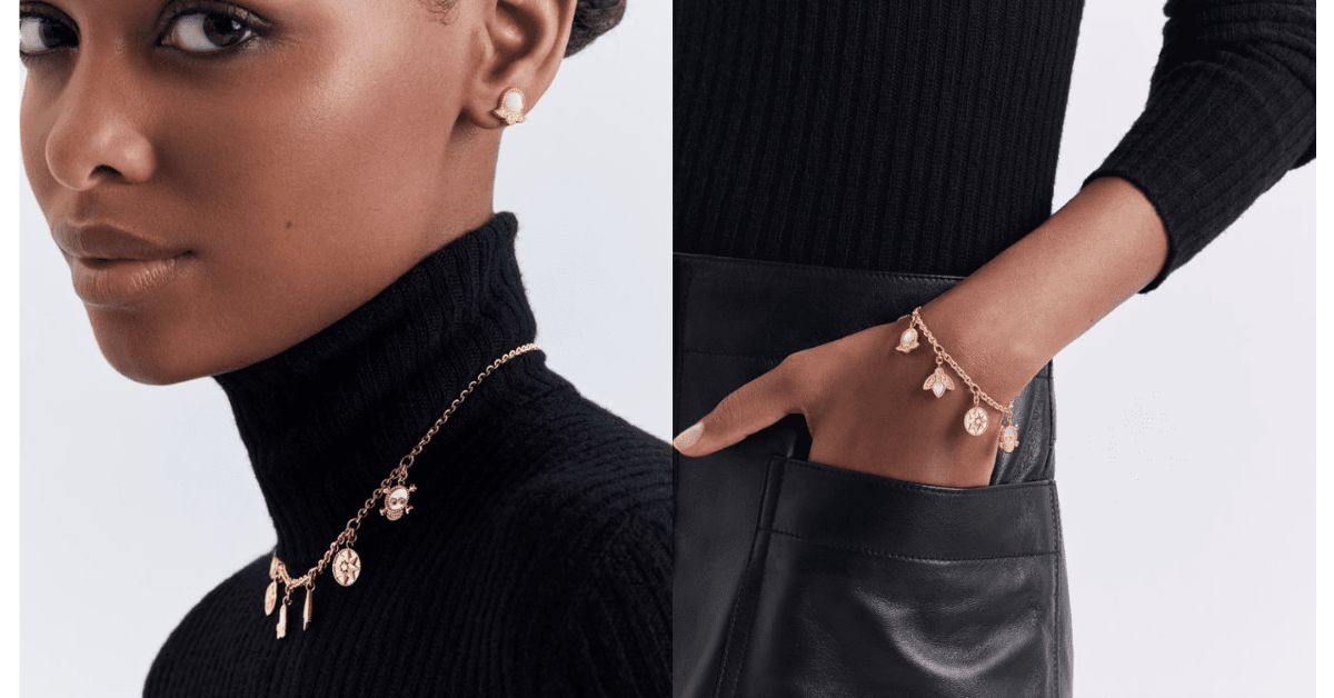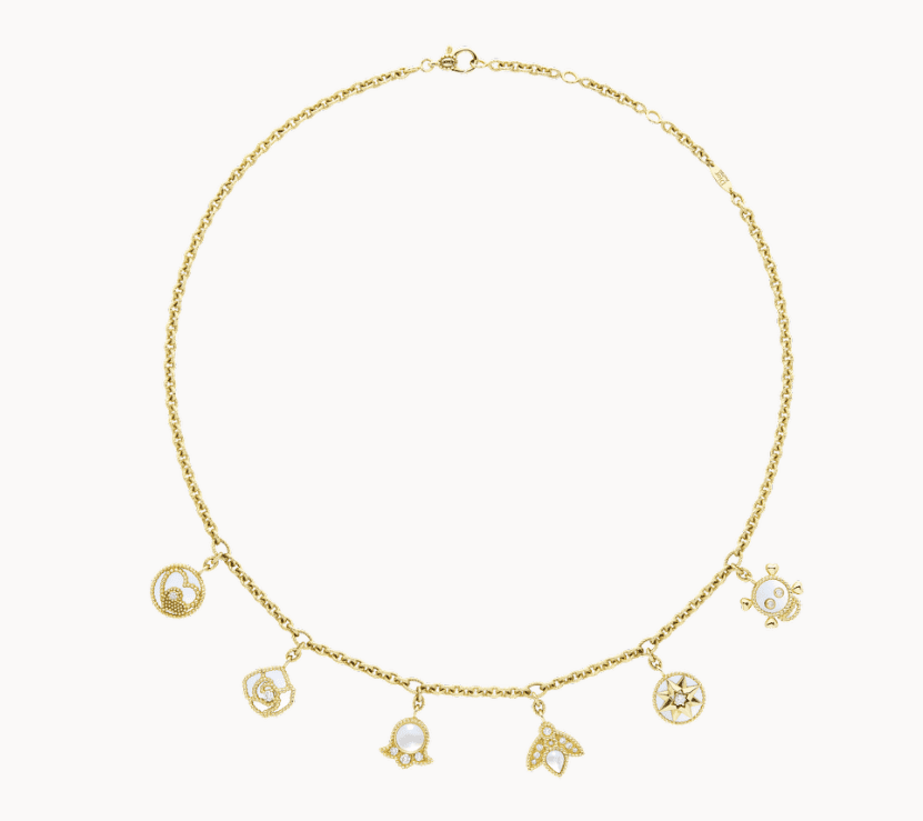Rose des Vents 系列的最新作品呈現經典標誌圖案,此款式集合迪奧先生一生中最重視並且信仰的符號標誌,將幸運星、鈴蘭、蜜蜂...等標誌,以鑽石點綴珍珠母和黃金吊飾,簡約優雅的設計,讓你擁有自己的專屬幸運符,在任何場合的日常裡都可以貼身配戴。