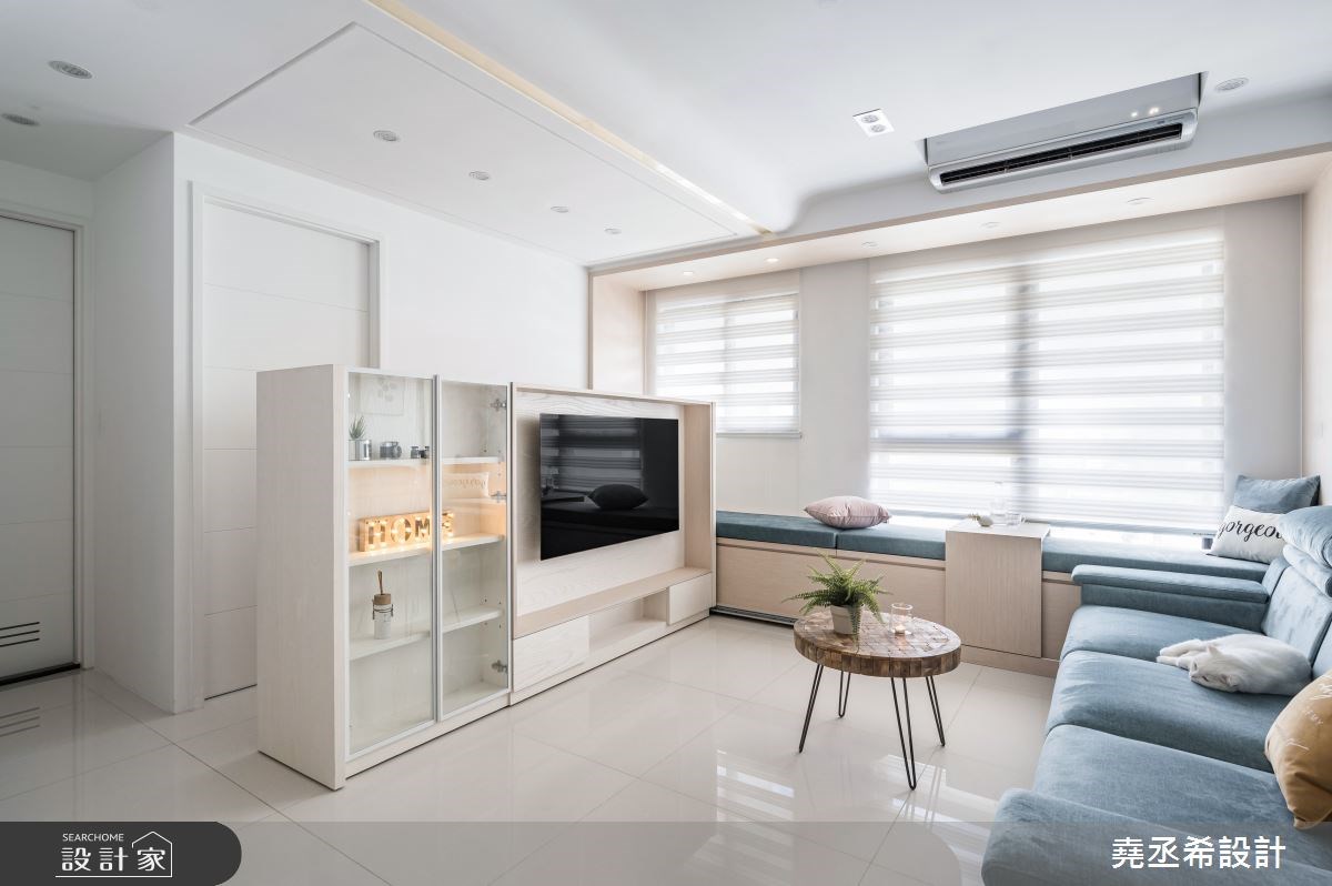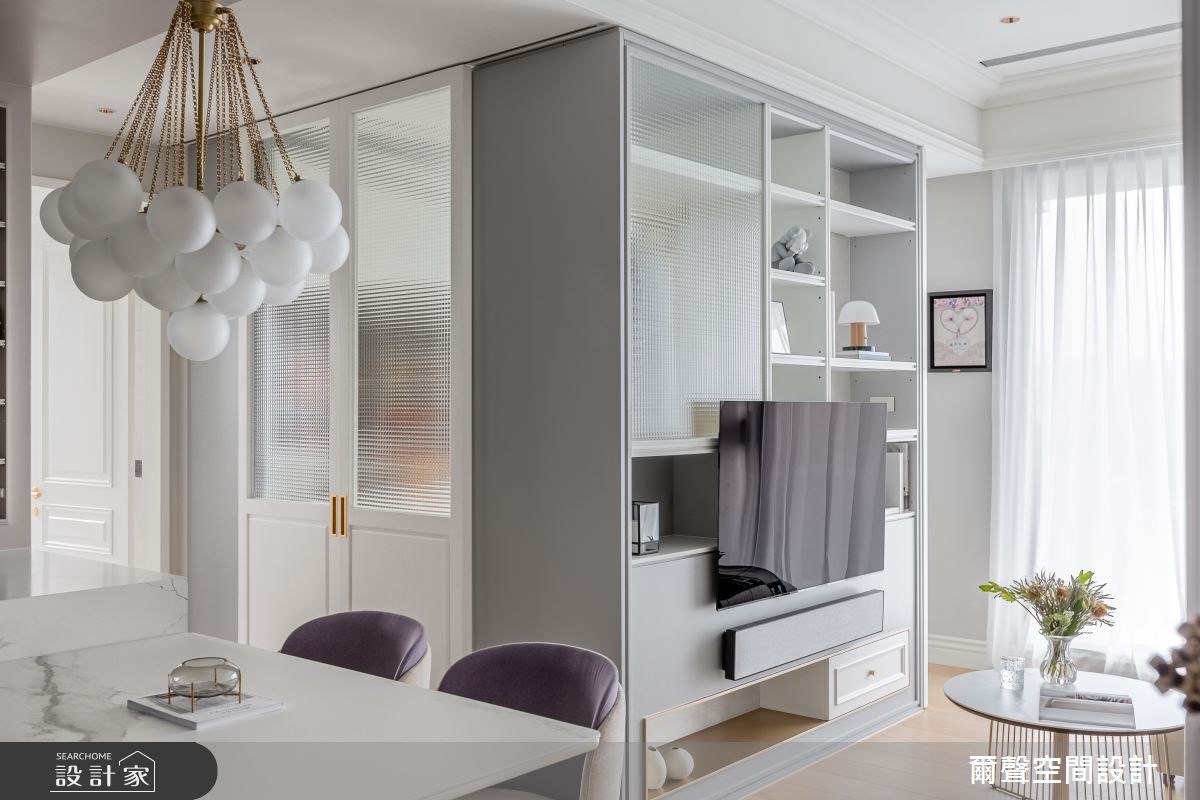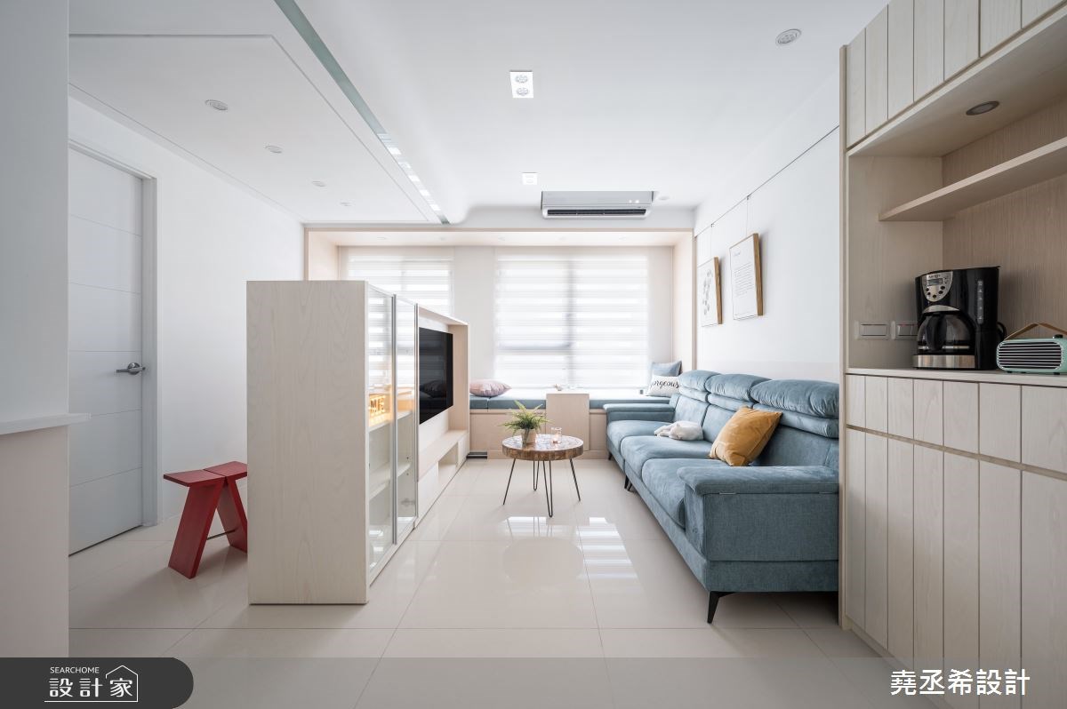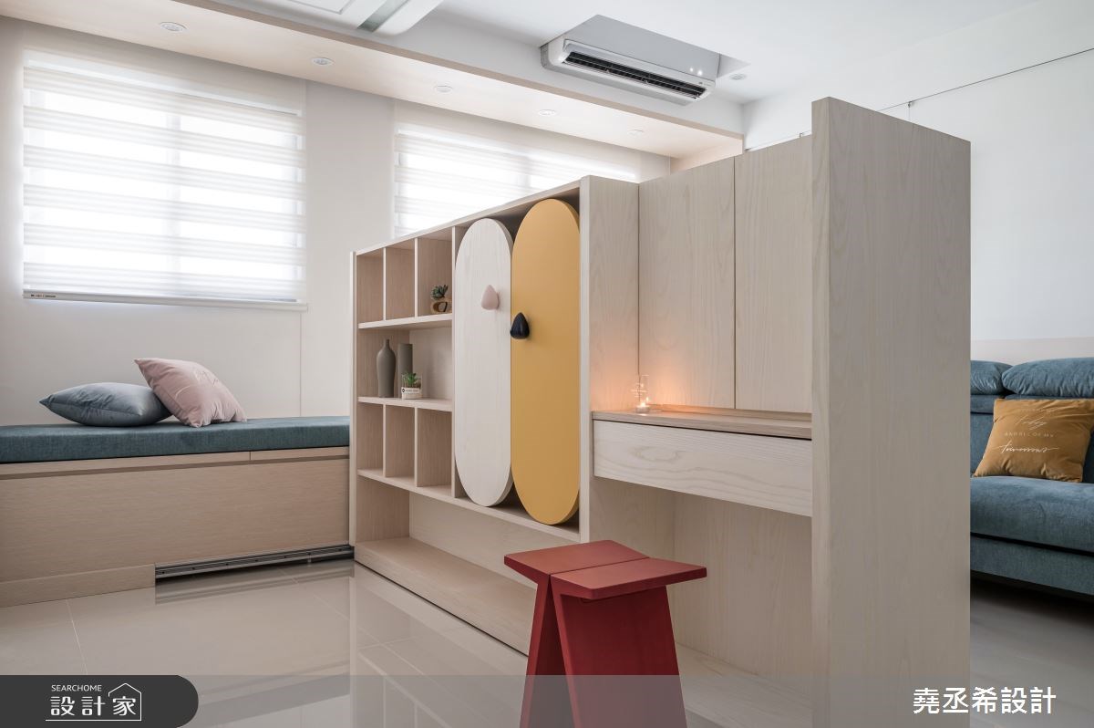 因屋案坪數有限,設計師利用電視牆後方,特別規劃書櫃、展示區和化妝桌,並在櫃體下方加入滑動式的滾輪,當有客人到訪時,或想要擁有看電視的舒適距離,利用電視櫃的移動推拉,就能隨時滿足最適合的格局比例!