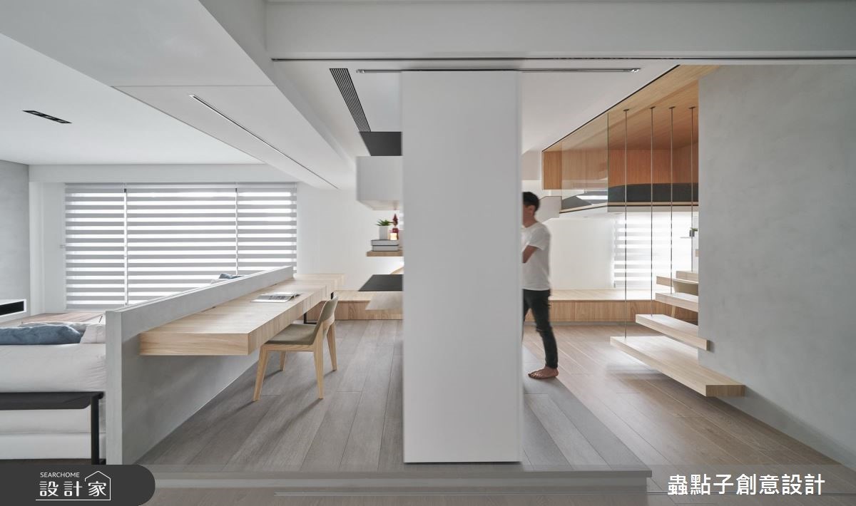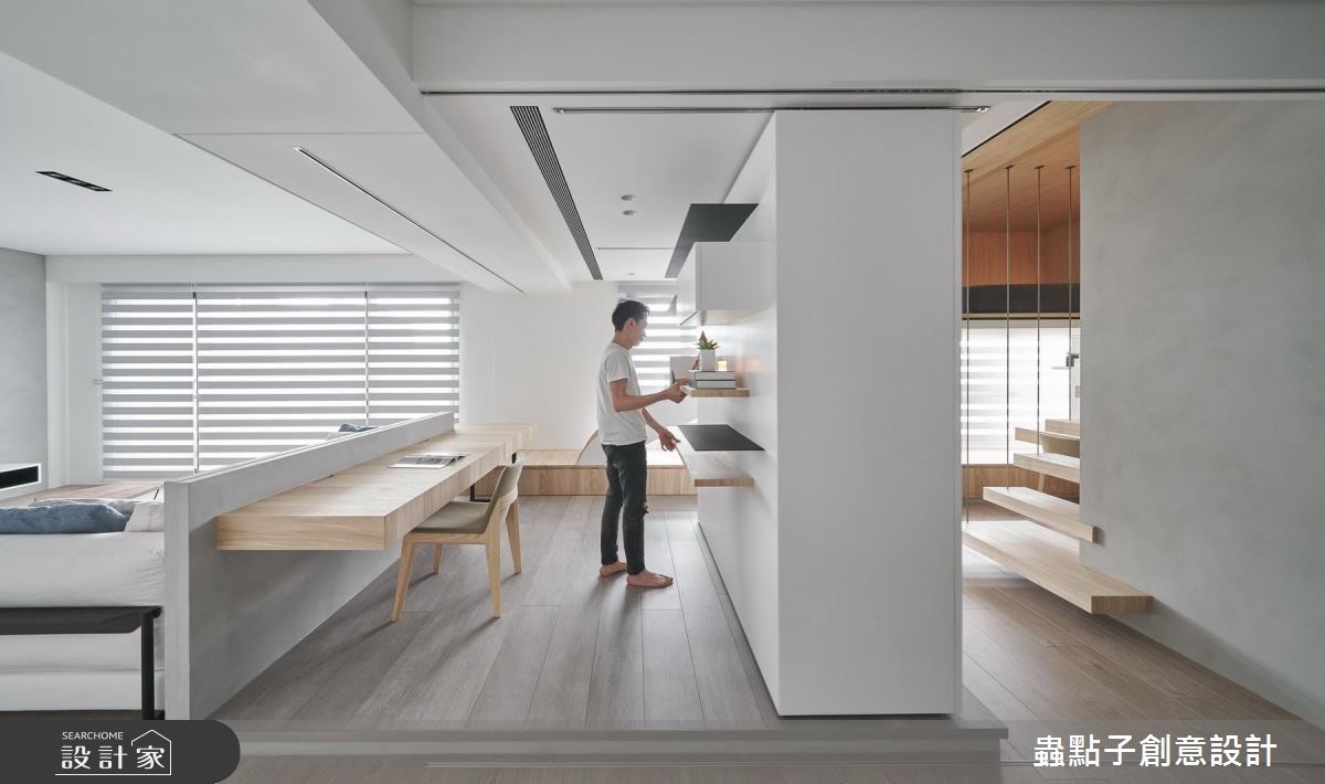 除了主臥室外,屋主也希望在 16 坪住宅預留親友的留宿空間,以及獨立的更衣室。因此設計師利用屋內中段打造多功能室,以彈性隔間設定和回字形動線,再結合可收納的掀床機能,不但一次完美達成屋主的期待,更釋放了清新明亮的光感!