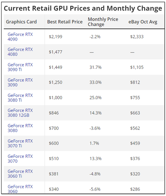 不確定是什麼原因,但猜測跟庫存比較有關係,因為 RTX 3090 Ti 這個月最好的價格是 1,449 美金,只比 RTX 4080 便宜一點點,而 RTX 4080 比 RTX 3090 Ti 還快,又是新一代顯卡,應該沒人會選 RTX 3090 Ti 才對。