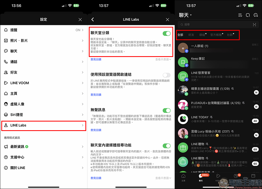 這麼做最大的好處,除了將該聊天室設為置頂的方式,在不想錯過好友的 LINE 訊息的同一時間,用戶可以在 LINE Labs 實驗室找到一項好用的也這將 LINE Lab 內的「聊天室分類」實驗功能給功能開啟呀!過去我們在 LINE 加了許多社群後, LINE 的未讀訊息清單總是數都數不完。聊天室分類功能開啟後,用戶可輕鬆篩選想閱讀來自哪類型的訊息,像是顯示全部、好友、群組、官方帳號或社群,至於 LINE 社群的訊息,則可等待比較有空時再點開讀取。