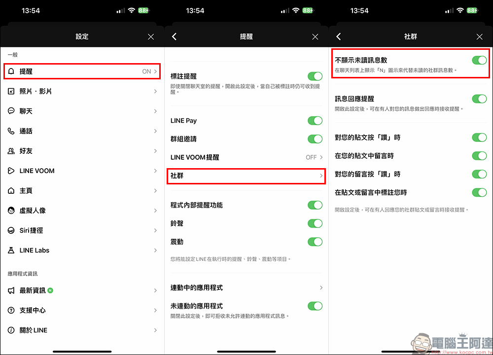 如果想避免自己遭受未讀訊息的打擾,可以先在「設定」找到一般設定內的「提醒」,接著依序點選「社群」設定,再來可將「不顯示未讀訊息數」的功能給開啟。