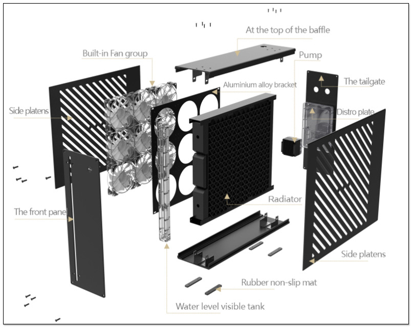 內部除了有 9 個 120 mm 風扇外,還具備一個 46 mm 厚的散熱器,由銅和黃銅混合製成,集成水泵提供高達每分鐘 700 升的水流量,測試壓力高達 1.5bar: