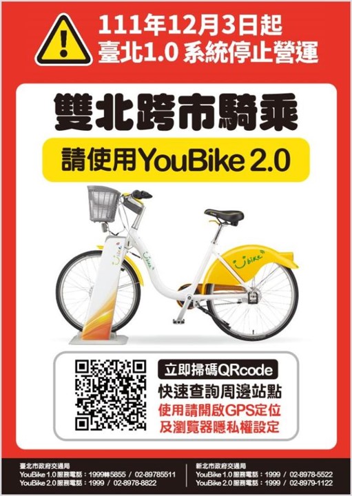 台北市交通局日前宣布YouBike2.0已達全市設置1200租借站的目標,YouBike1.0將於12月3日零時起停止營運。因應YouBike1.0將在台北市完全停止營運,針對跨縣市的公共自行車使用民眾推出過渡時期的作法並呼籲新北市民屆時要2.0才能還車,否則得支付350元的調度費。