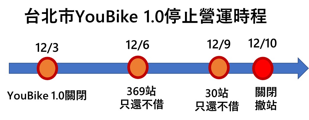 YouBike1.0將於12月3日零時起停止營運,屆時北市境內369個租借站「只還不借」,12月10日起陸續拆除租借站的車柱,預計明年農曆年後全面拆除完畢,從新北等外縣市赴台北市的民眾須騎乘2.0才能還車。