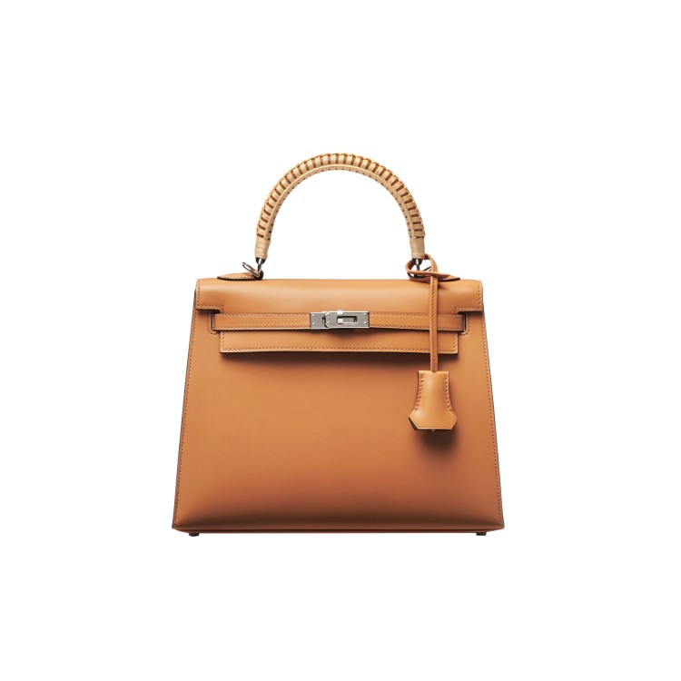 金棕色的 Tadelakt 小牛皮,搭配上銀色的扣件配色,這款「Kelly II Sellier」帶著凱莉包該有的經典外型,但在提把處巧妙的換上了柳條編織,讓該包款保留了該包款典雅的樣貌,但同時又具有春夏清爽的度假氣息。