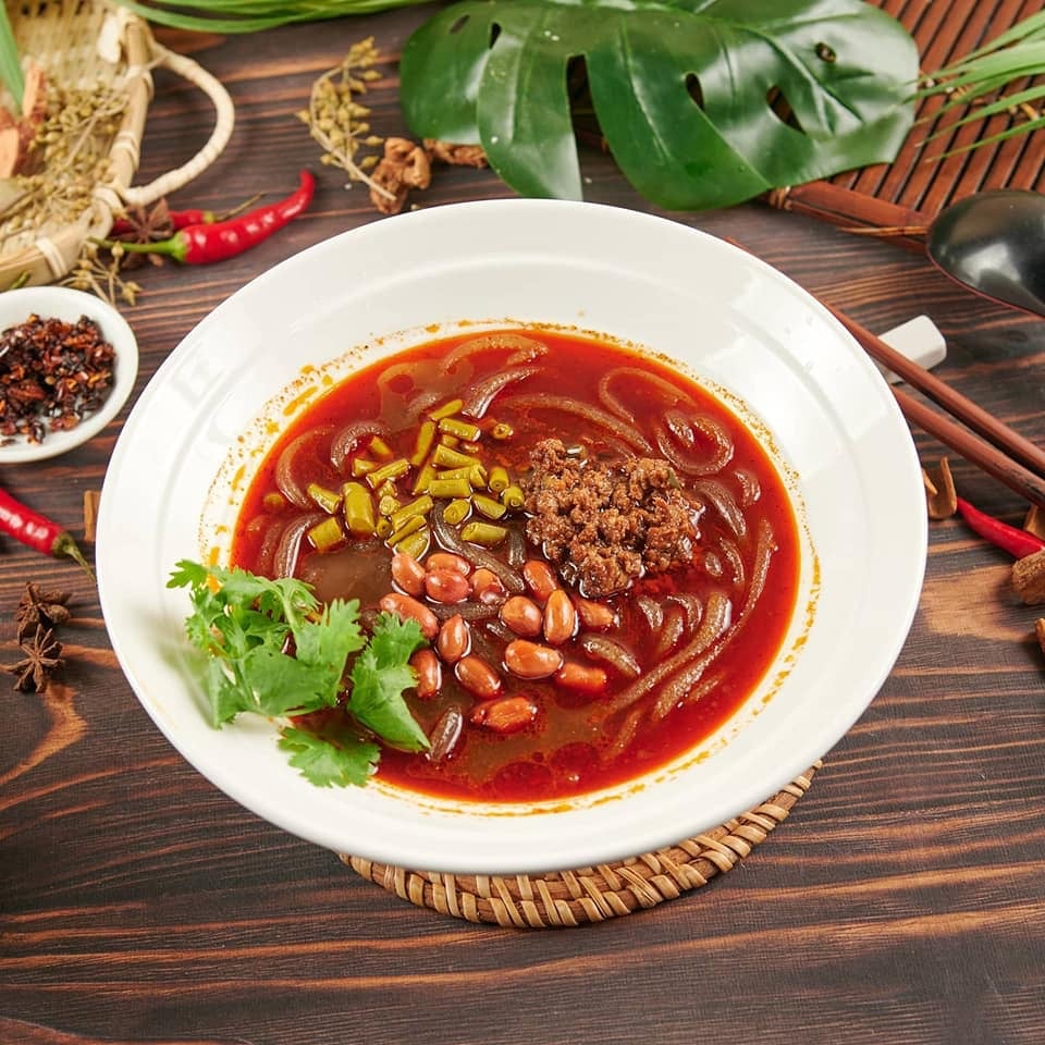在西門商圈和永康街都有店面的「嗜鼎」,專賣各式四川口味特色小吃,像是麻辣小火鍋、水煮魚、麻辣滷味等,而他們家的酸辣粉,選擇十分多樣,包含了原味酸辣粉、牛肉酸辣粉、酸辣肥腸粉等,口味也很正宗,湯頭以店家特製的秘密醬汁配上豬骨熬煮數小時,紅薯粉的口感很Q,辣度也能客製化調整。