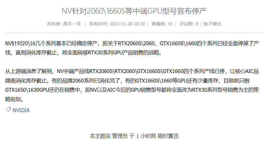 根據外媒 VideoCardz 報導,中國博板堂(boardchannels)網站近日有人爆料一篇 NVIDIA 宣布停止生產 RTX 2060 和 GTX 1660 系列顯卡的消息,IT 之家也有報導,並寫到這爆料人是供應鏈人士。而停產的 RTX 2060 系列包含 RTX 2060 Super、RTX 2060,GTX 1660 系列則是 GTX 1660 Super、GTX 1660,市面上所有庫存賣完就沒有了,未來將不會再生產,同時中階顯卡的重點產品將轉向 RTX 30 系列。