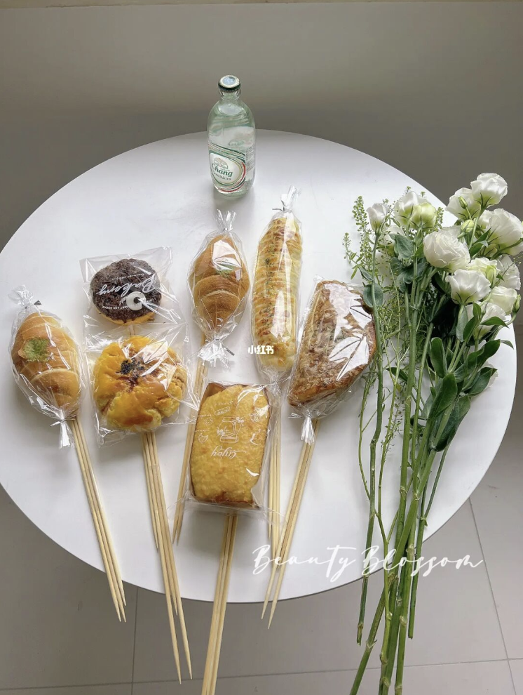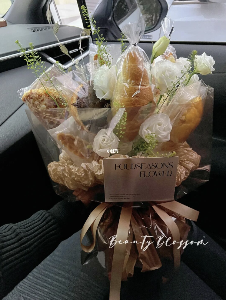 這束法式麵包花束最初是在小紅書上流行起來的~其實只要準備好美美的包裝,裡面的麵包可以隨你自由搭配,依照女朋友喜歡吃的麵包口味來搭背絕對不會錯啦~送禮簡直送到心坎裡了!