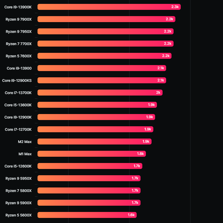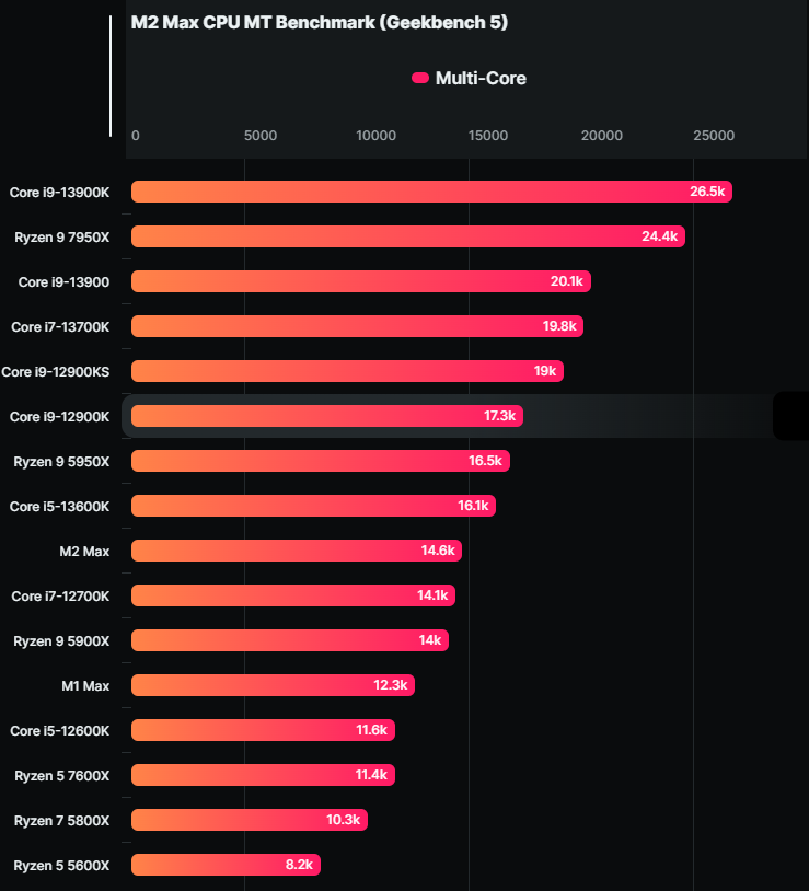 而跟最新 Intel Core i9-13900K 和 AMD Ryzen 7950X 相比,差距就蠻明顯的,M2 Max 落後許多,多核部分甚至低於 Intel 上一代 i9-12900K,當然,功耗比部分又是另外一件事了。