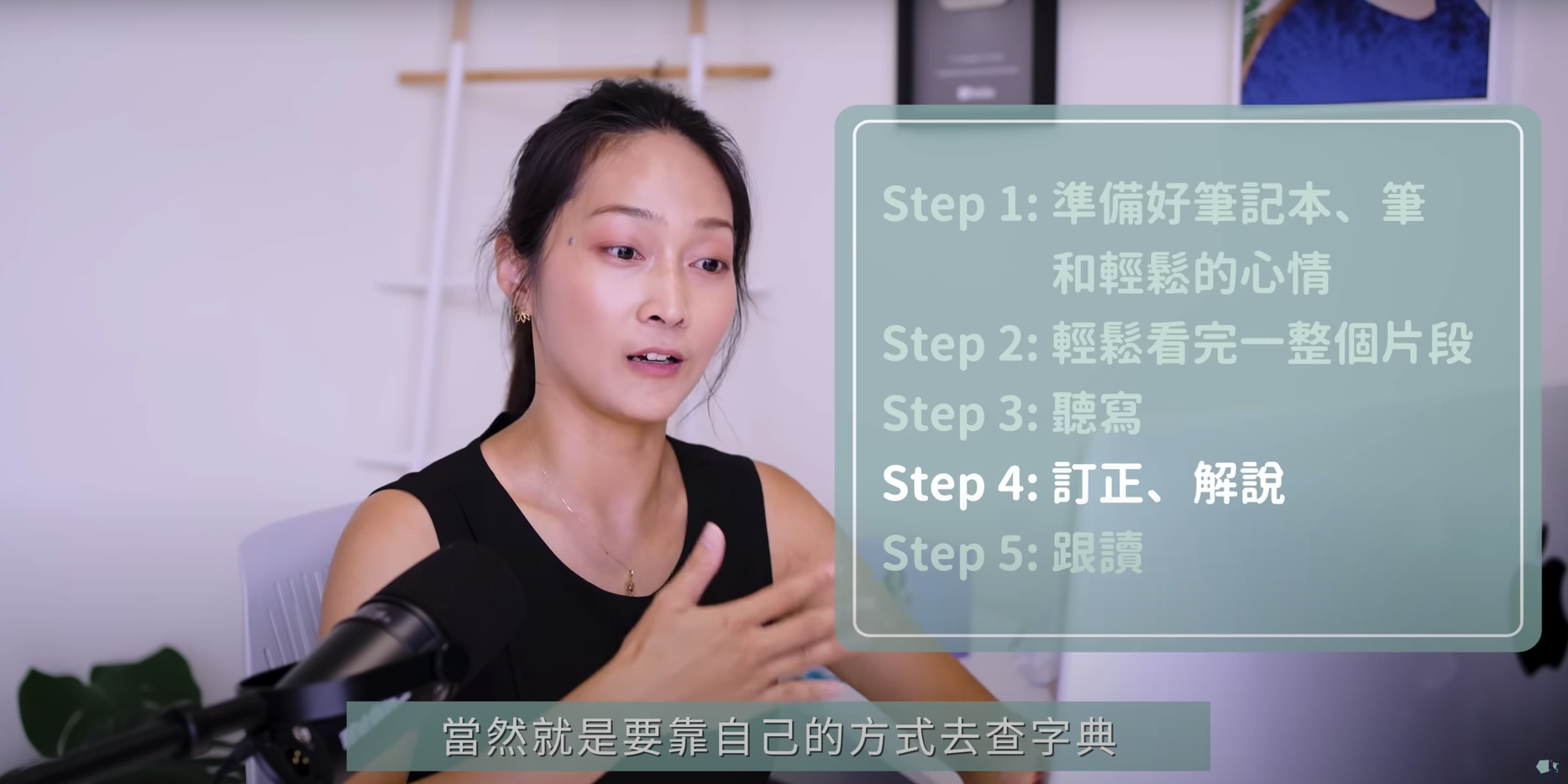 第四步就是來訂正自己寫的下句子對不對啦~私下自學的時候可以透過字典來查找自己的句型和拼字有沒有錯,但影片中就可以先跟著老師來訂正啦~