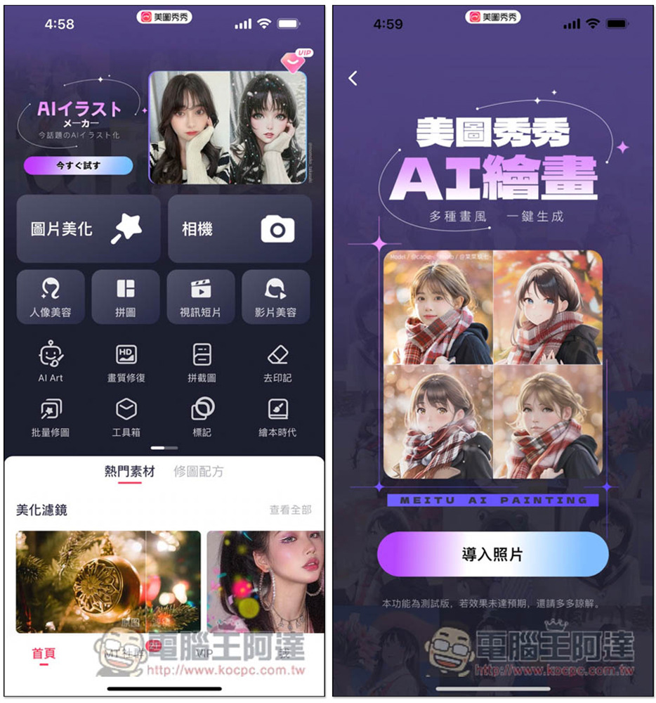 提供最近非常火熱的 AI 繪畫功能是「美圖秀秀」,這是一款免費 App,下載安裝好後打開,」首頁最上方就會看到 AI 繪畫的選項,我人在日本,所以上方顯示日文,但點進去會是中文。接著就點擊下方「導入照片」: