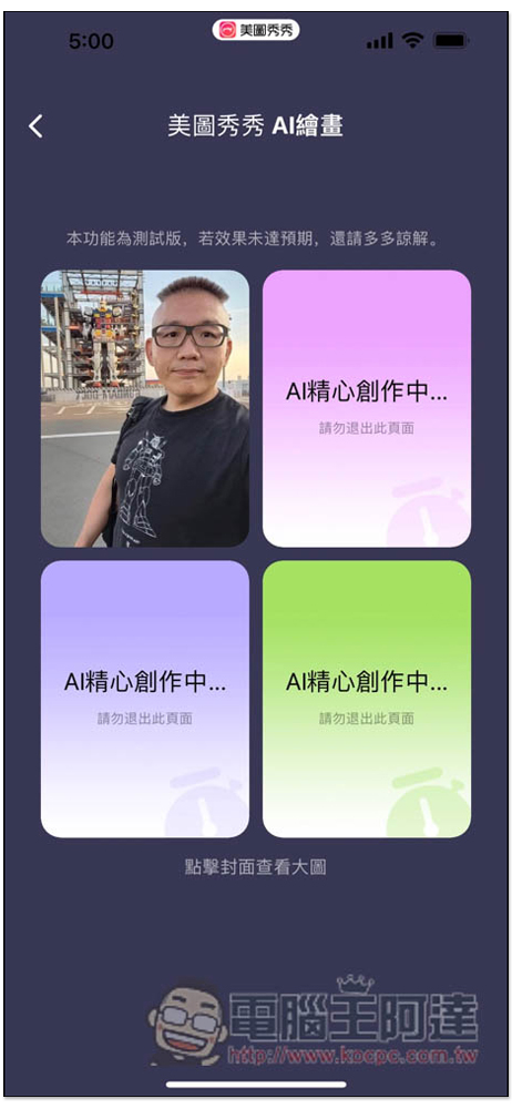 接著就會開始創作,總共有三張,處理時間不算久,大概十幾秒就好了。另外上方也有註明「本功能為測試版,若效果未達預期,還請多多諒解」,有時候可能出來的圖片沒有像其他人這麼好: