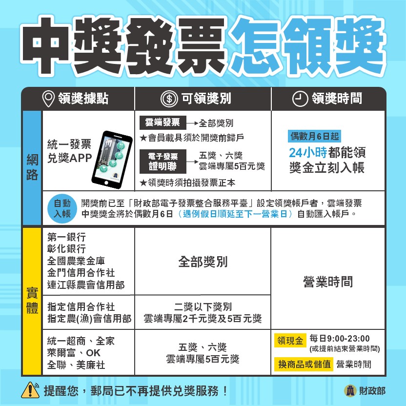 收到電信業者中獎通知,可直接持附有電子發票載具條碼資訊之領獎收據,依據所中獎金額至財政部指定兌領之實體機構領獎。