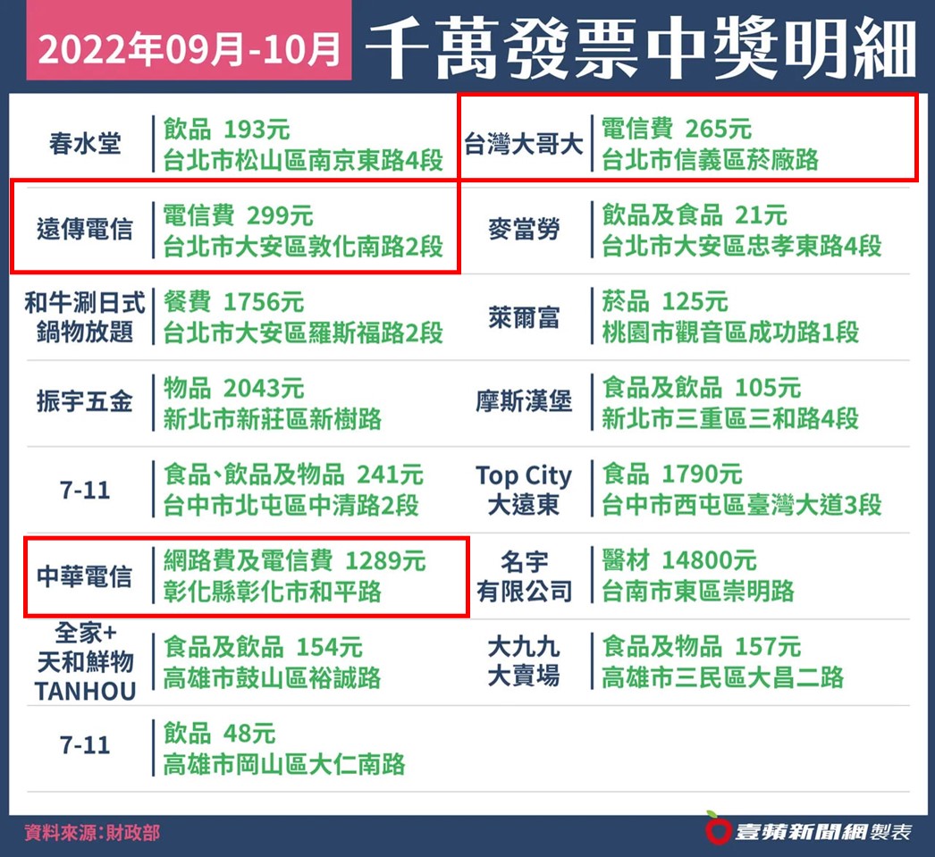 財政部12月1日下午公布9~10月統一發票中獎清冊,1000萬特別獎共開出15張,其中光是三大電信業者電信帳單用戶就佔了3張,中獎比重相當高。為配合財政部電子發票政策及響應環保,各大電信業者針對用戶每月新增的電信帳單都採取開立電子發票並上傳至財政部電子發票整合服務平台。由於每個月皆會產生2千多萬張電子發票,自然會產生許多打電話中統一發票的幸運得主。