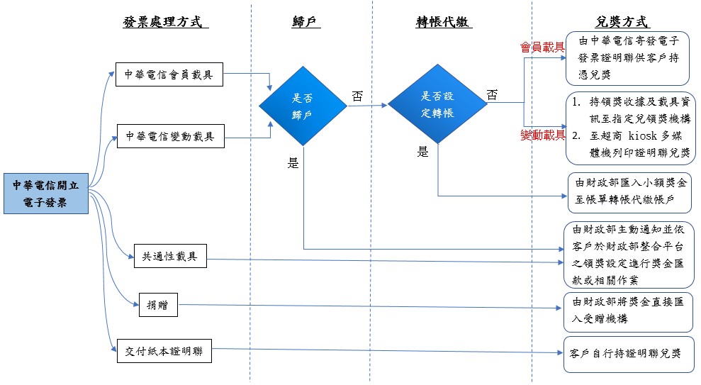 五大電信業者自105年1月份起電信費帳單新增之款項都會於收到繳款入帳三日內開立電子發票並上傳至財政部電子發票整合服務平台,若用戶的電子發表中獎,電信業者就會發送簡訊或e-Mail通知並請用戶去持該期帳單上的載具號碼去兌獎。