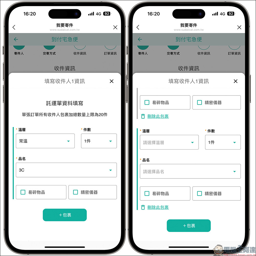 下一步則是選擇包裹的溫層、品名、數量以及是否為易碎物品或精密儀器,這階段單張訂單能一次寄送最多 20 件包裹。