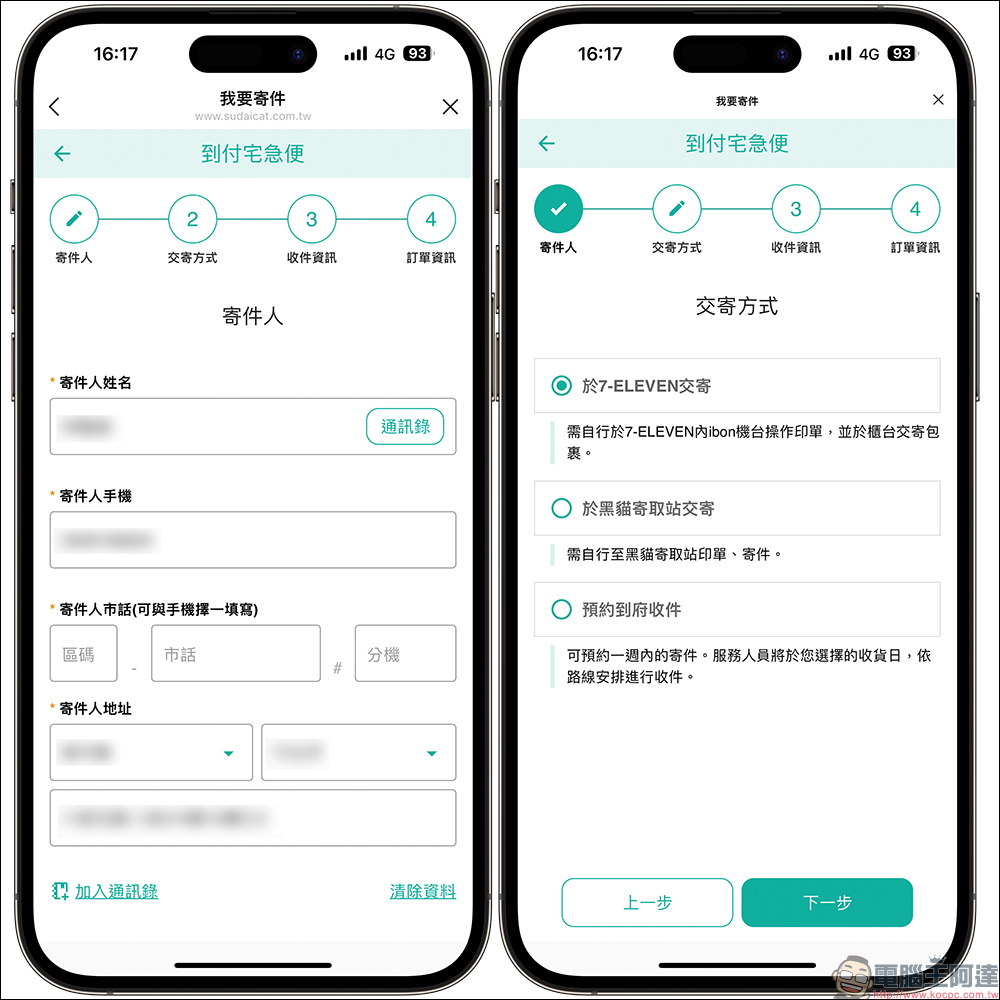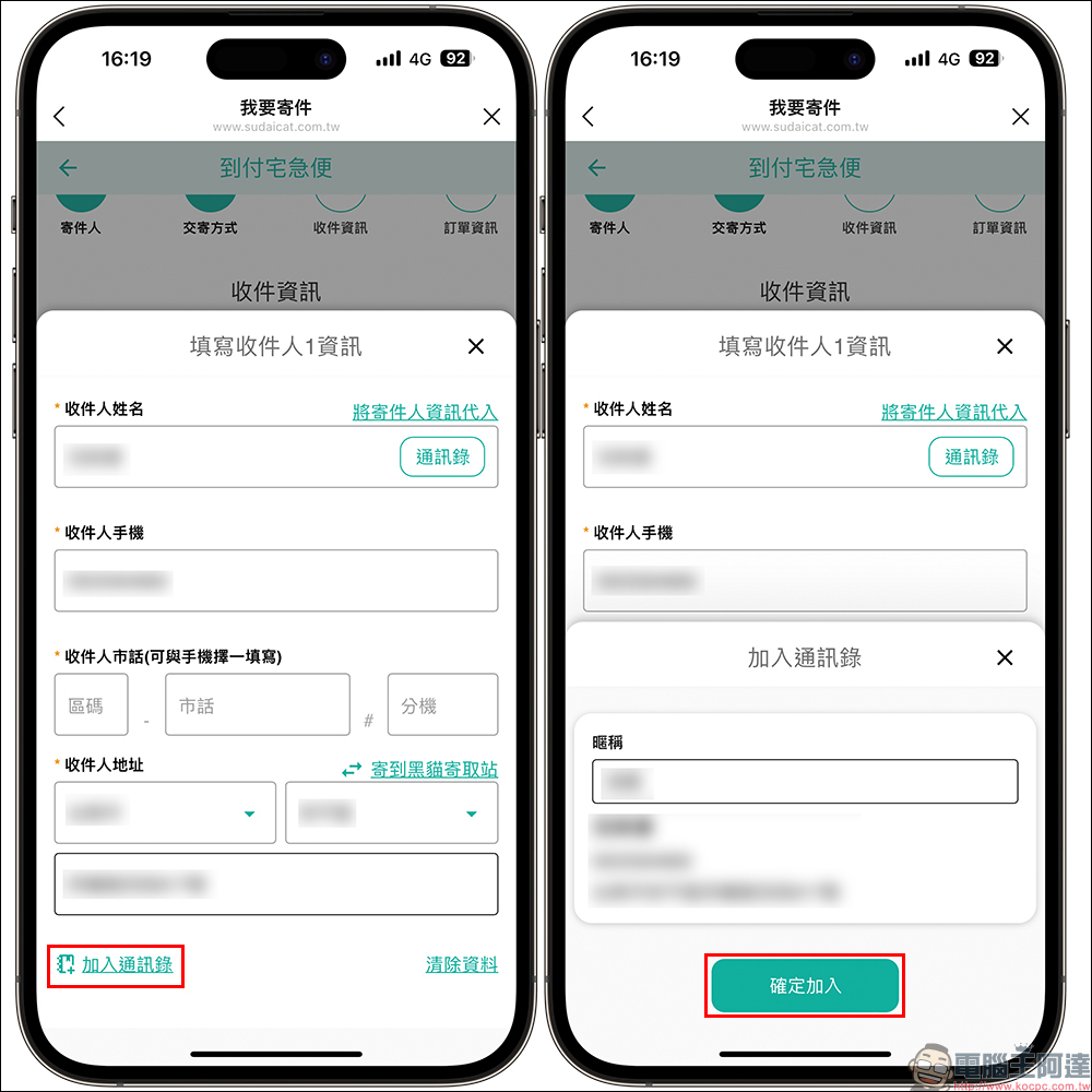 接著輸入收件人資訊,像是收件人姓名、手機以及地址。如果各位有經常寄送的對象,也可以直接將對方加入到通訊錄,下次寄件就只要從通訊錄加入資料即可。