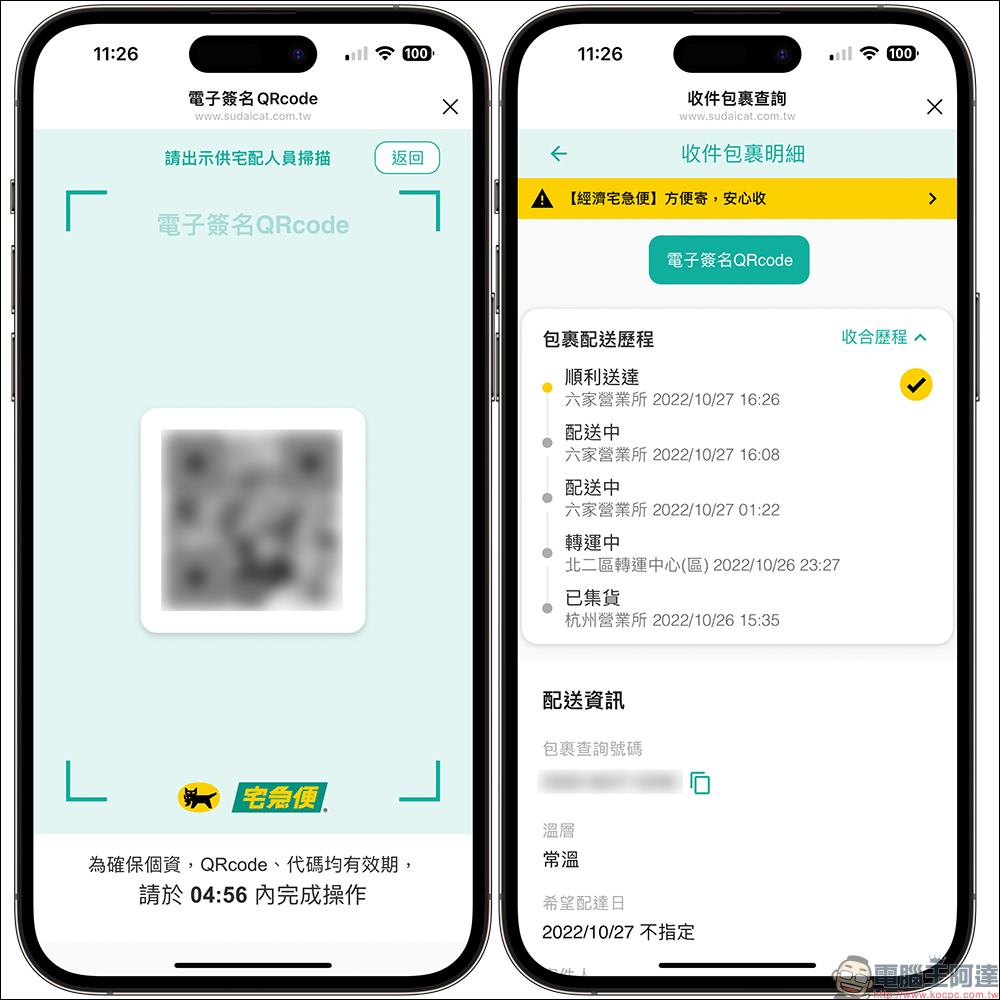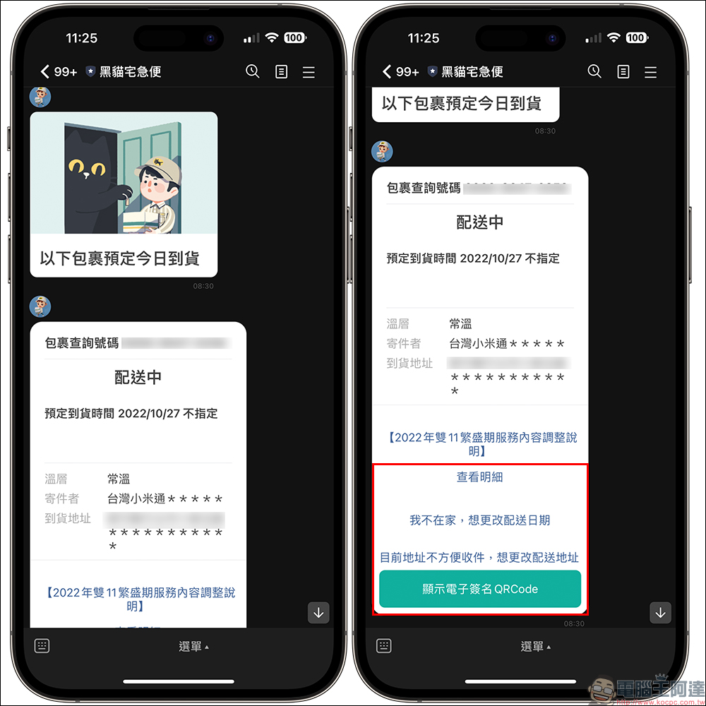另外,如果該包裹是需要簽收的,則可點選「顯示電子簽名 CR Code」在簽收時出示給宅配人員掃描。當然,包裹的配送歷程也通通都能在 LINE 直接查詢,十分方便!