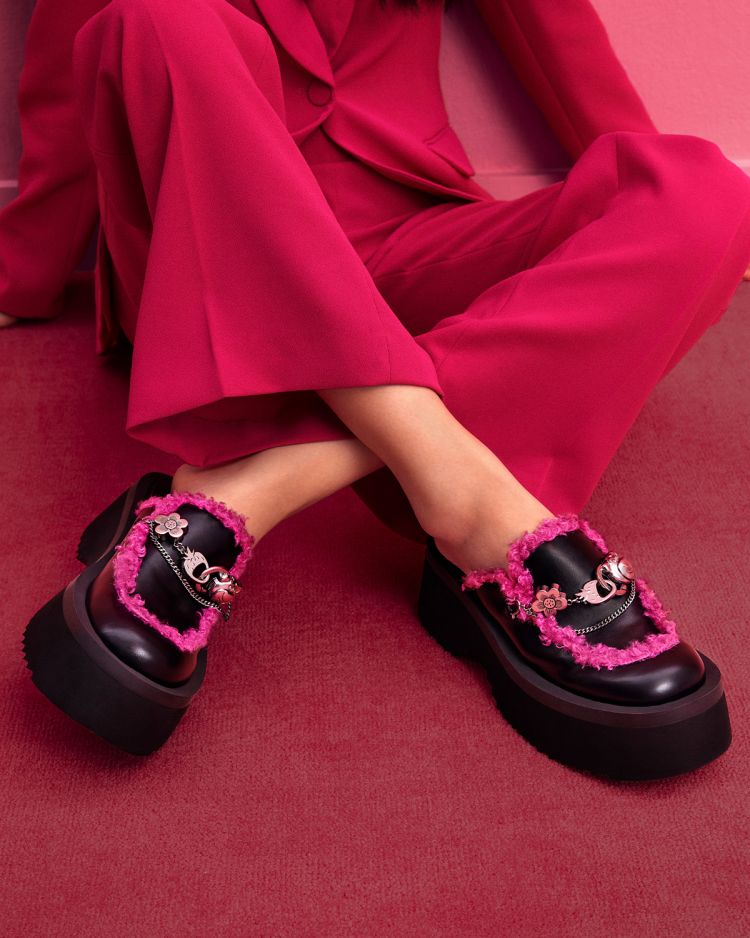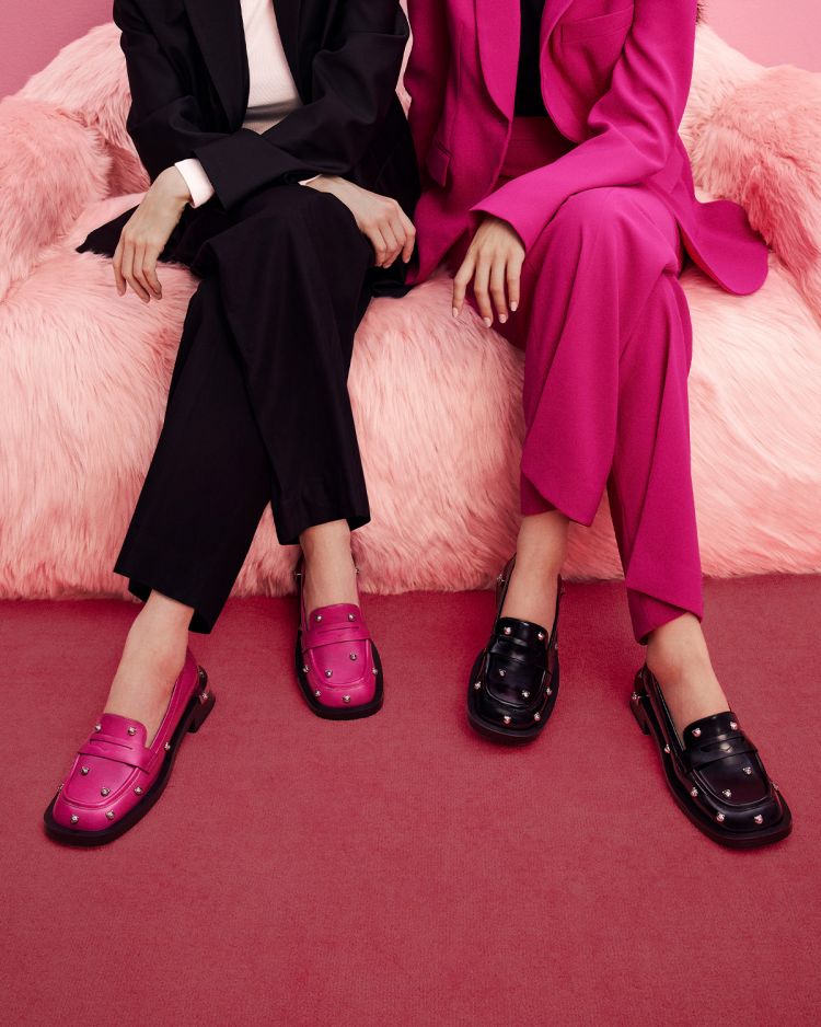 以往大家避之唯恐不及的「芭比粉」在今年意外成為熱門色!熊抱哥該角色的粉色外型恰好緊抓這股潮流,因此在設計上 Charles & Keith 亦延伸其配色,讓鞋履、包包都換上芭比粉的色彩,其中一雙樂福鞋最吸引儂編的目光,因為在上頭點綴的鉚釘元素僅看居然是熊抱哥的圖樣!其叛逆又可愛度滿分的設計哪個女孩能抵擋?