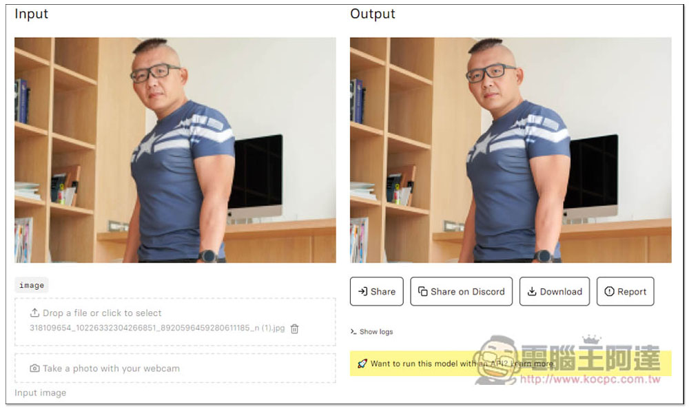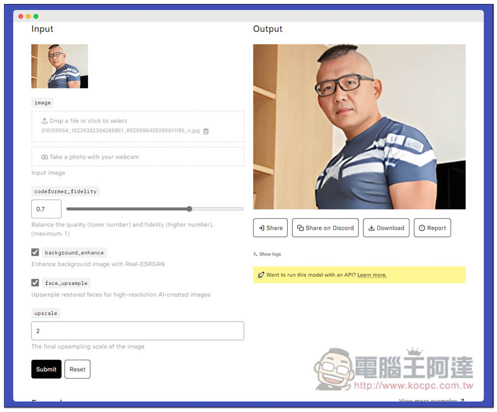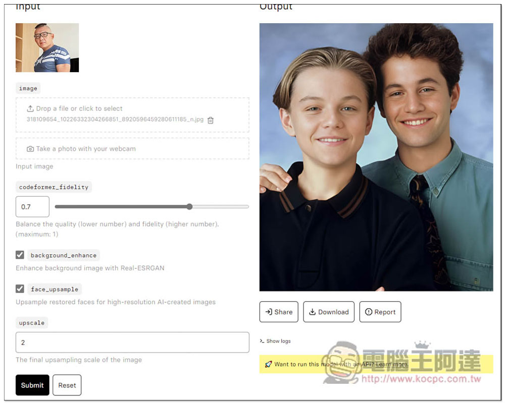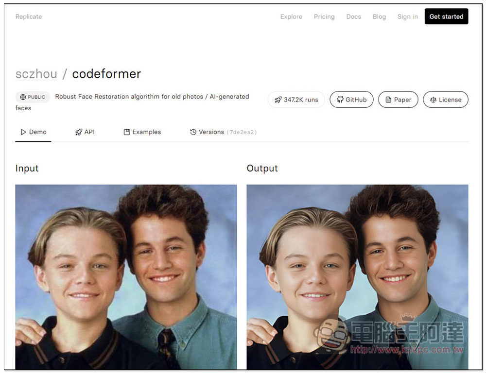 就會進入 codeformer 的工具頁面,這邊也有輸出前後(input 與 output)的照片範例: