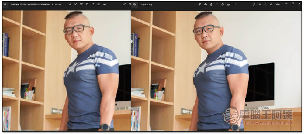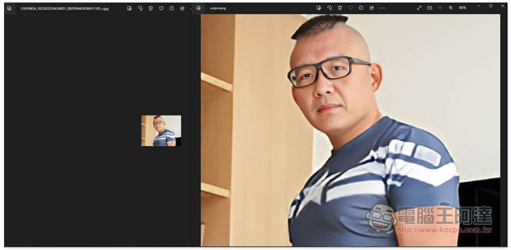 這就是放大前後的比較圖,放大後的解析度達到 1312x1024,將近快 10 倍,不說很多人可能會以為右邊是原圖,左邊是縮小後的圖片,事實上相反,左邊才是原圖: