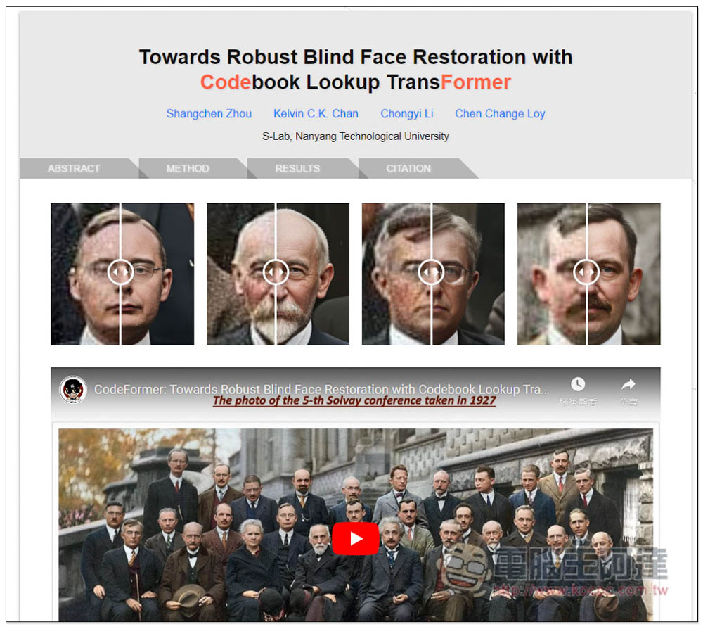 進到 CodeFormer 網站之後,你可以先看看上方四個範例圖片,左右滑動可以比較原圖和變清晰後的人臉照片。嚴格來說這款工具主要是用在把模糊的臉變清晰,意味著如果你手邊有晃到的照片,就能用它來改善,我測試放大效果也超讚:
