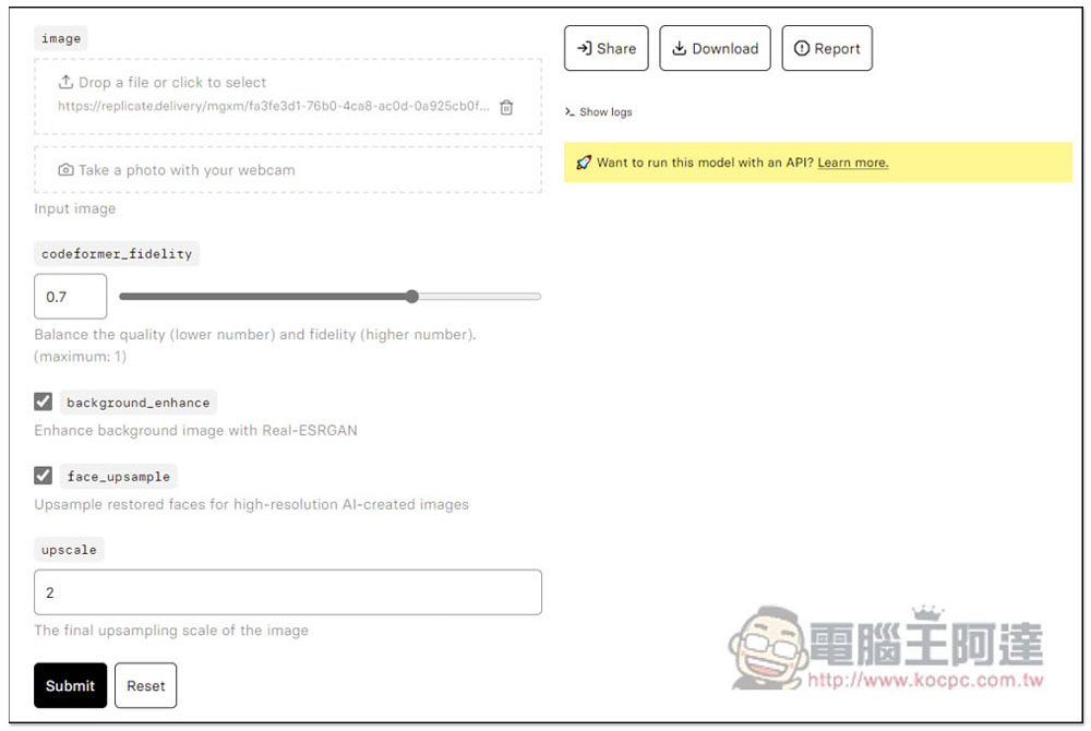 我以這張解析度只有 150x117 的照片為例,超級小張,數值都不用更改,直接按下方的 Submit: