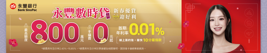 永豐銀行 | 數時貸 | 0元起 | 首期0.01% | 800萬 | 2.43%~15.65% |