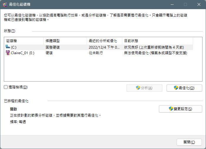 什麼時候會容易碎片化呢?像是你從 A 磁碟複製了大量檔案到 B 磁碟時,或是電腦裡面有龐大的遊戲檔案時,這時候你就可以打開「重組並最佳化磁碟機」工具來進行掃描以查看是否有重組的必要性。