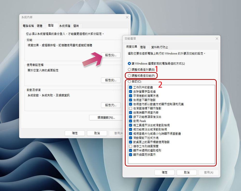 - 將 Windows 外觀及效能設定改為「調整成最佳效能」。
