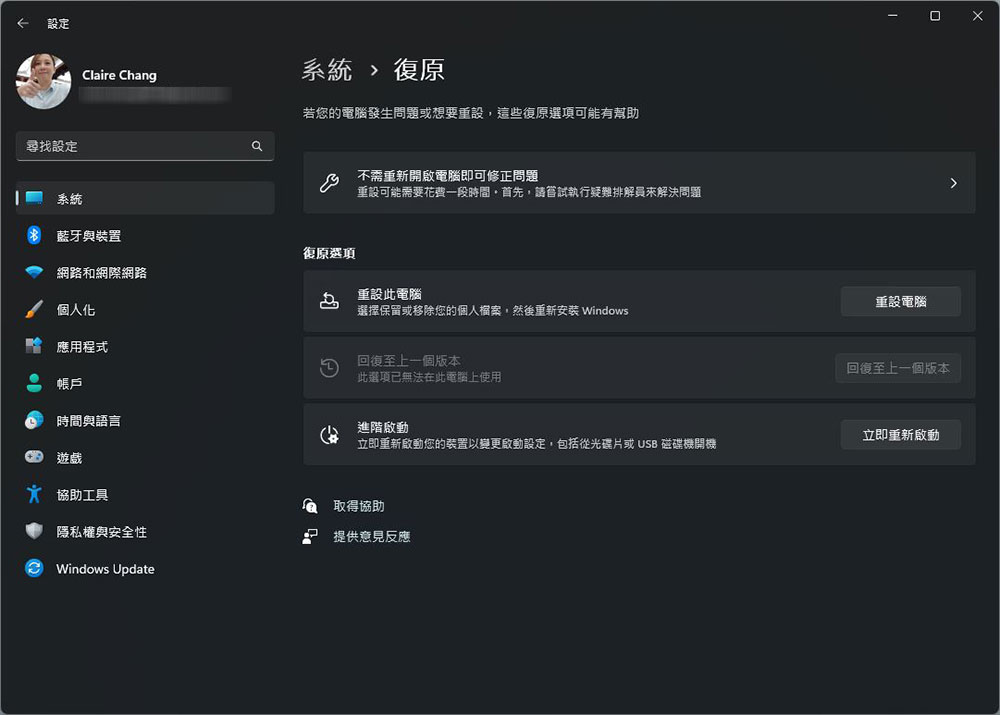 如果上面其他辦法對你來說都沒有解決問題,那麼就只能使出重新開機之外的最後大招了:重新安裝系統。在現代版本的 Windows (指 Windows 8、8.1、10、11)上重新安裝系統比過去都容易,打開「設定」在「系統」分頁中的「復原」這項去執行即可,不用去搞什麼安裝碟就可以重新安裝,同時也可以更簡單的重新將電腦恢復出廠設定。這類功能都會在刪除已經安裝的程式和將系統設定回歸預設同時保留文件檔案。