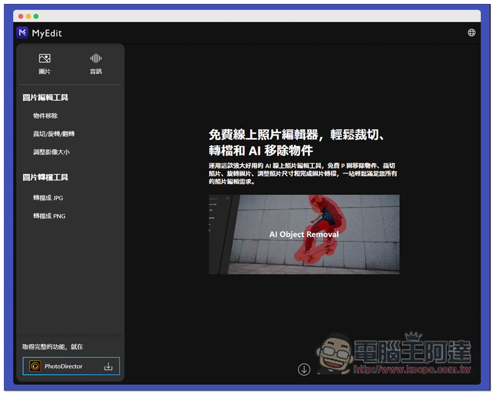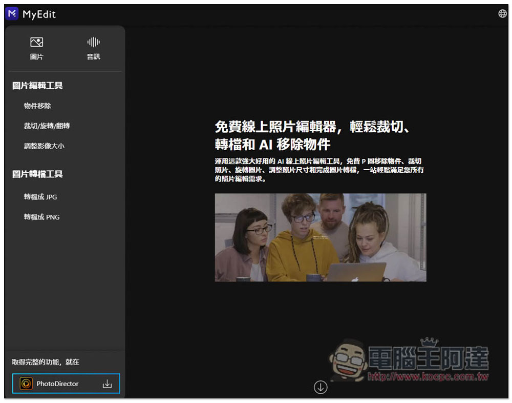 進入之後,功能選單位於左側,有圖片、音訊兩種。圖片提供「圖片編輯工具」和「圖片轉檔工具」,前者有物件移除、裁切/旋轉/翻轉、以及調整影像大小三個功能。後者則支援 JPG、PNG 二種格式轉檔: