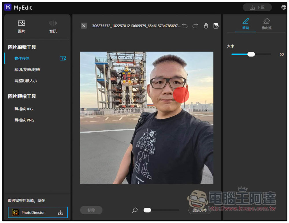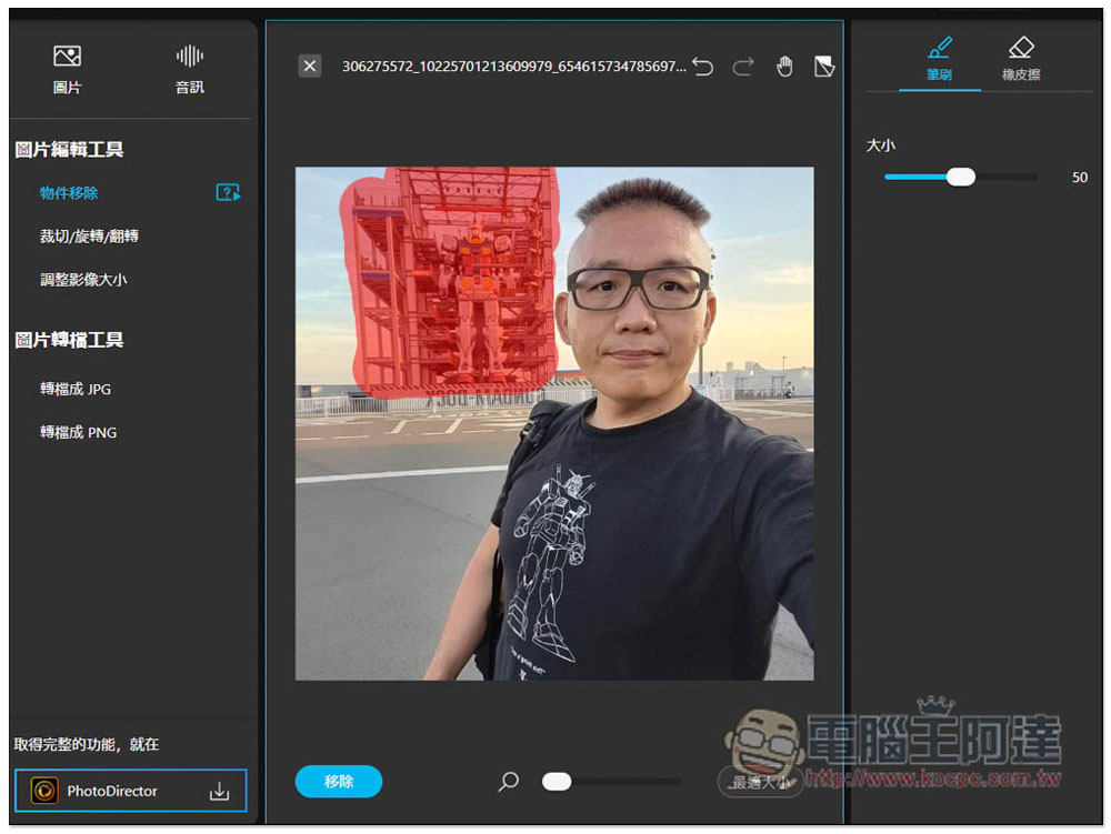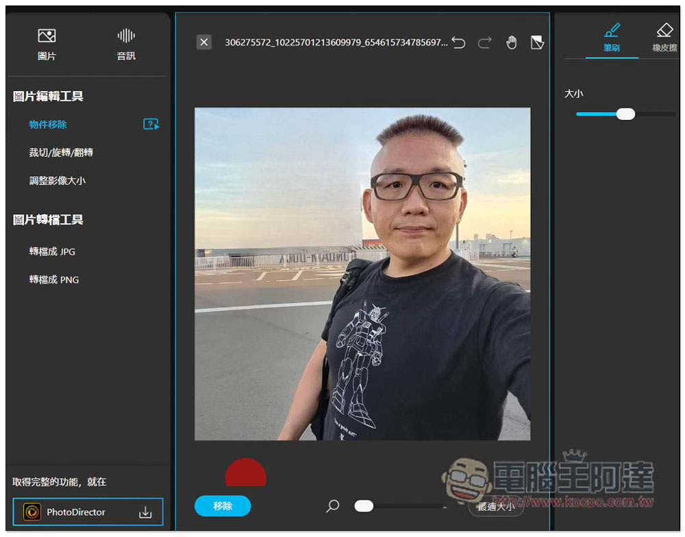 每一項功能的操作方式都蠻簡單,以物件移除來說,圖片上傳後,就用滑鼠把要移除的物件給圈選起來,右側可以調整筆刷大小和橡皮擦: