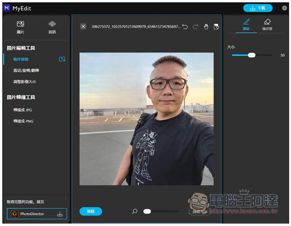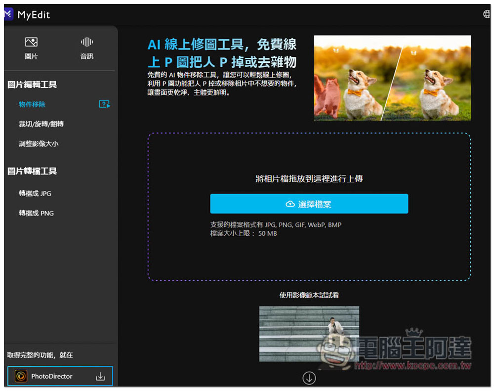 每個功能都有一些檔案限制,像是物件移除,支援的檔案格式有 JPG、PNG、GIF、WebP、BMP,單檔可達 50MB: