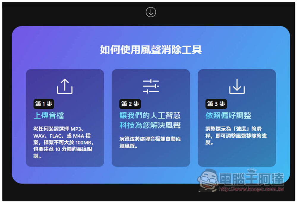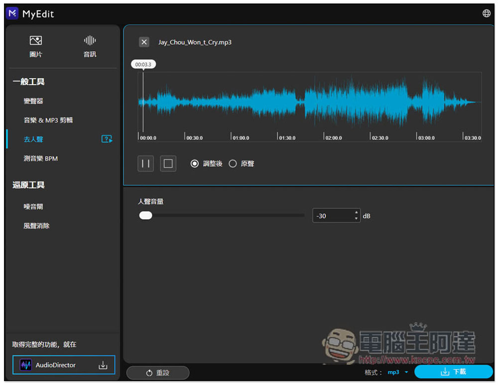 去人聲部分,單檔上限為 100MB,時間長度不能超過 10 分鐘,支援的檔案格式有 MP3、WAV、FLAC 與 M4A,上傳之後就會去除,你可以點擊「調整後」與「原聲」來試聽去除前後差異,下方還能手動調整人聲音量,這一個就蠻不錯的,確實真的可以去除聲音的人聲:
