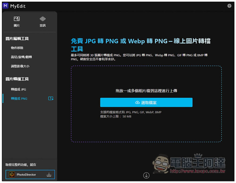轉檔部分,可一次轉檔多張,最多 30 張,不過 50MB 檔案上限不確定指的是單一張,還是全部。可以 JPG 轉 PNG、Webp 轉 PNG、GIF 轉 PNG 或 BMP 轉 PNG: