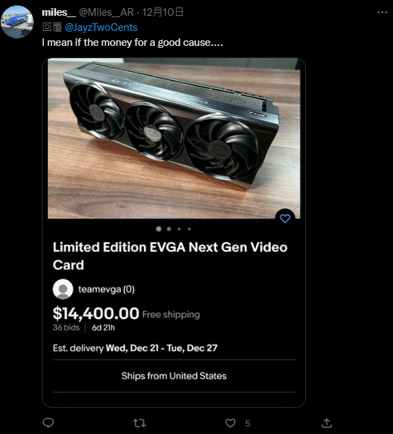 猜測可能是 EVGA 沒想到拍賣價這麼誇張,因此趕緊喊停,最終以多少成交也不清楚。