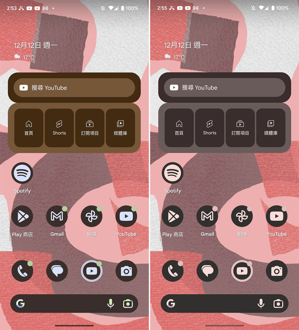 [caption id="attachment_473102" align="alignnone" width="350"]小工具的外觀遵循了 Material You 設計語言的視覺效果,並且加入對動態色彩的運用,因此小工具會以什麼顏色呈現,主要取決於你目前所選用的主題色、桌布是什麼,還有放在主螢幕上的什麼位置。