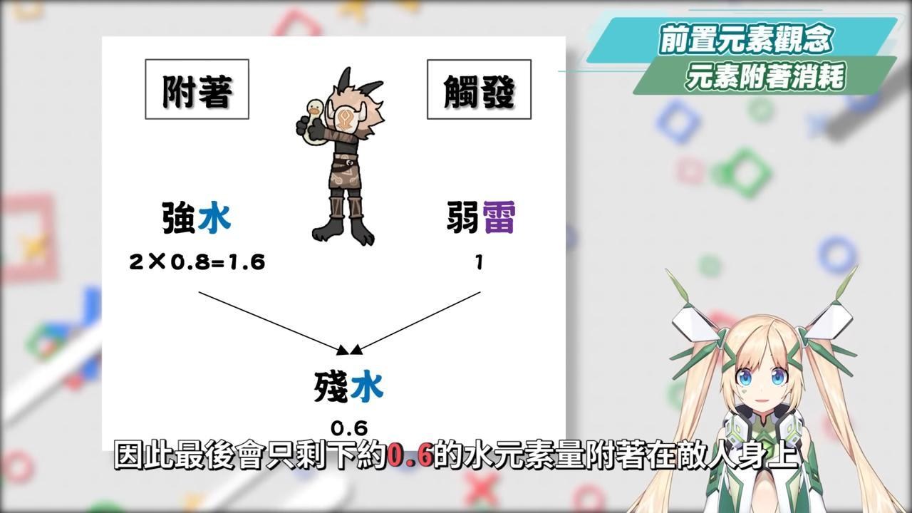 而因為草元素剋制水元素,因此草與水元素會是以2:1的比例進行消耗,若是先對敵人上弱草元素附著,需要2次的弱水元素才能反應完畢草元素,反之若是先對敵人上弱水元素附著,則後面只需要1次弱草元素即可使弱水元素消耗完畢。