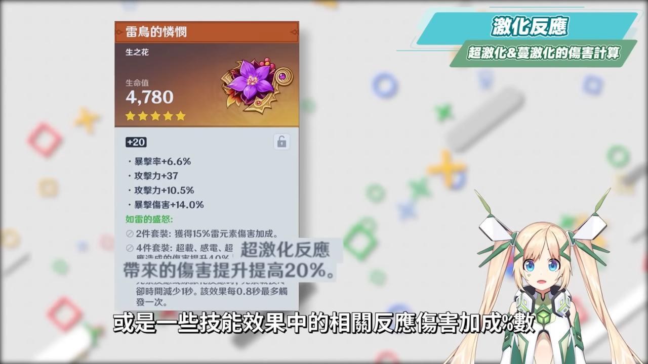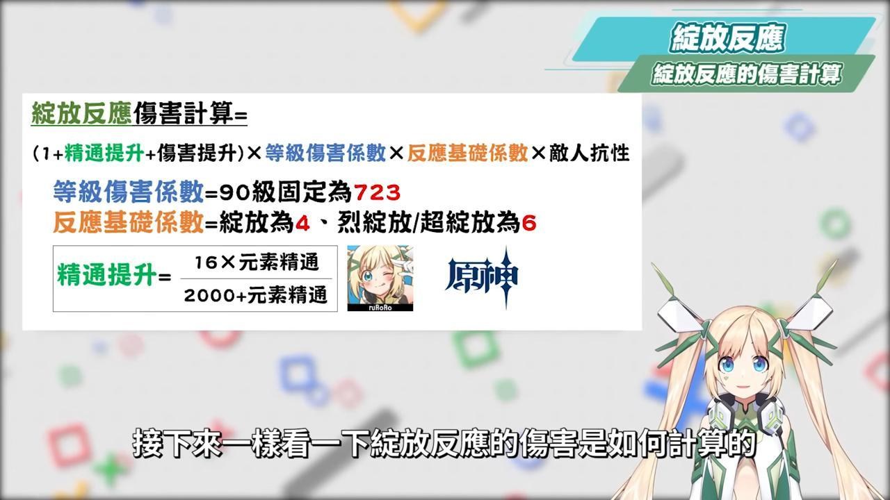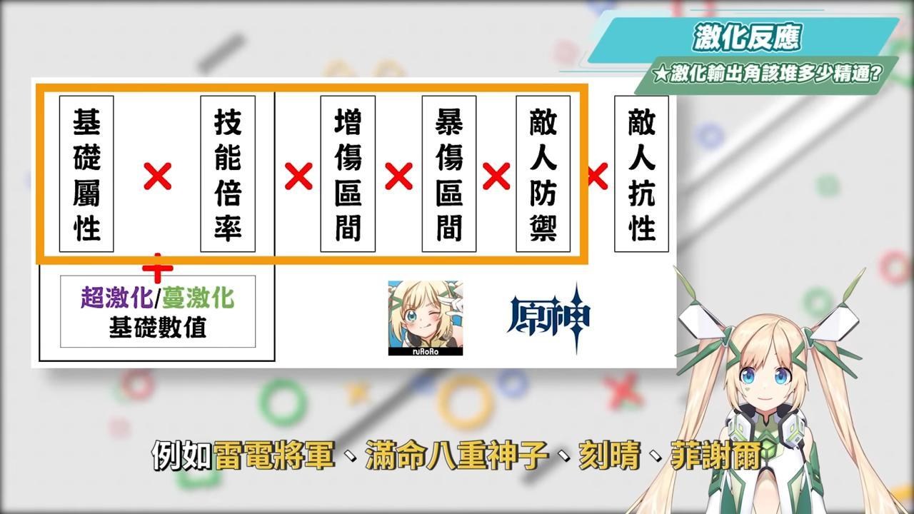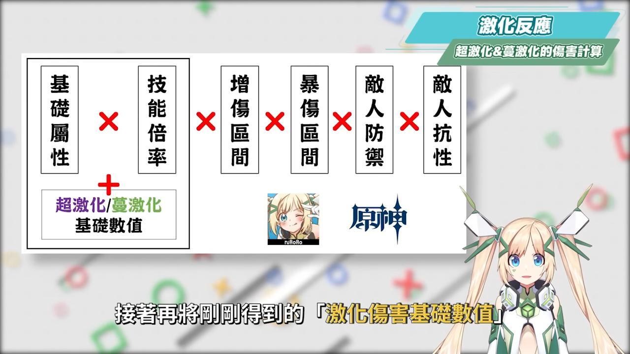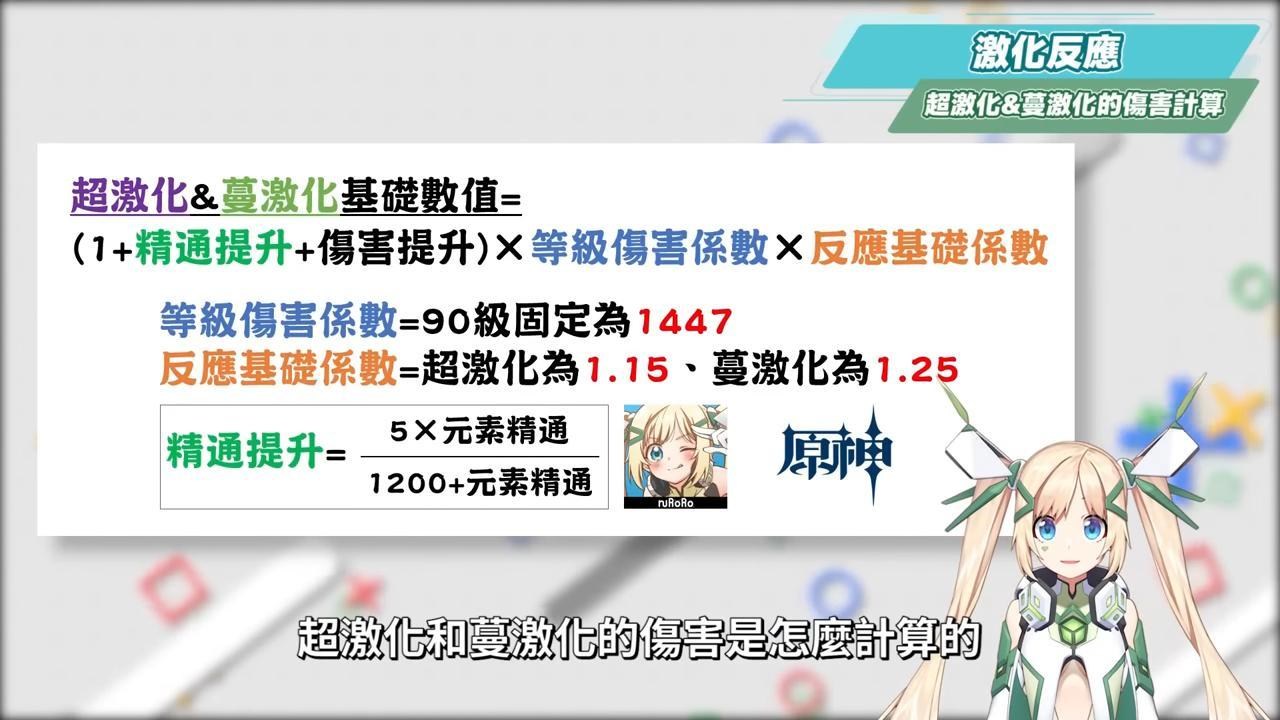 484有人看到算式就暈了,解說這個算式並不是要大家去計算自己的角色傷害會有多少,而是我們要知道,在原激化狀態下的效果,會讓下次草雷附著傷害的基礎攻擊倍率增加,所以我們可以看到激化反應的傷害是可以吃得到暴擊率與暴擊傷害的加成,從這邊就可以知道激化反應是有別於劇變反應的計算,並且也和角色自身的等級、元素精通、增傷、敵人防禦與抗性係數有關,因此在培養激化隊的角色時,要特別拉抬上面提到的幾個重點項目。