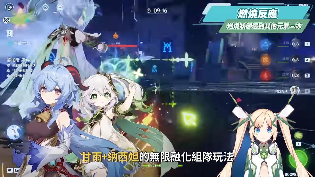 當火草元素接觸進入燃燒反應時,此時閃爍的火元素符號為強火,若用1次的弱冰來打燃燒狀態的敵人時不會將火元素消耗完,可以再上草元素延長燃燒狀態。所以這時我們若透過甘雨的二段蓄力射擊,剛好2次弱冰可以直接結束燃燒反應,第一下弱冰接觸燃燒狀態的火元素時會觸發融化反應,第二下消耗完燃燒的火元素結束狀態,因此只要搭配能夠持續上草的角色,就可以和甘雨搭配打融化反應,所以在納西妲出來後也出現了甘雨+納西妲的無限融化組隊玩法,再搭配上火的班尼特,對高傷害敵人或單體BOSS可以最後一位選擇鍾離,需要對群可以換成萬葉,後面會再說詳細的操作手法。